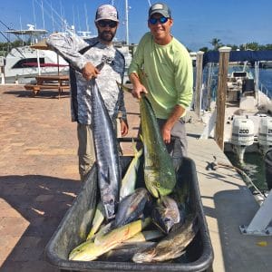 Offshore you will find loads of Mahi Mahi, some Skip Jack Tuna, Wahoo under floaters and weed lines and Swordfish (SEE THE VIDEO BELOW) on the Continental Shelf. Tarpon fishing in the channels nearshore the month of May and June is a must do as well.