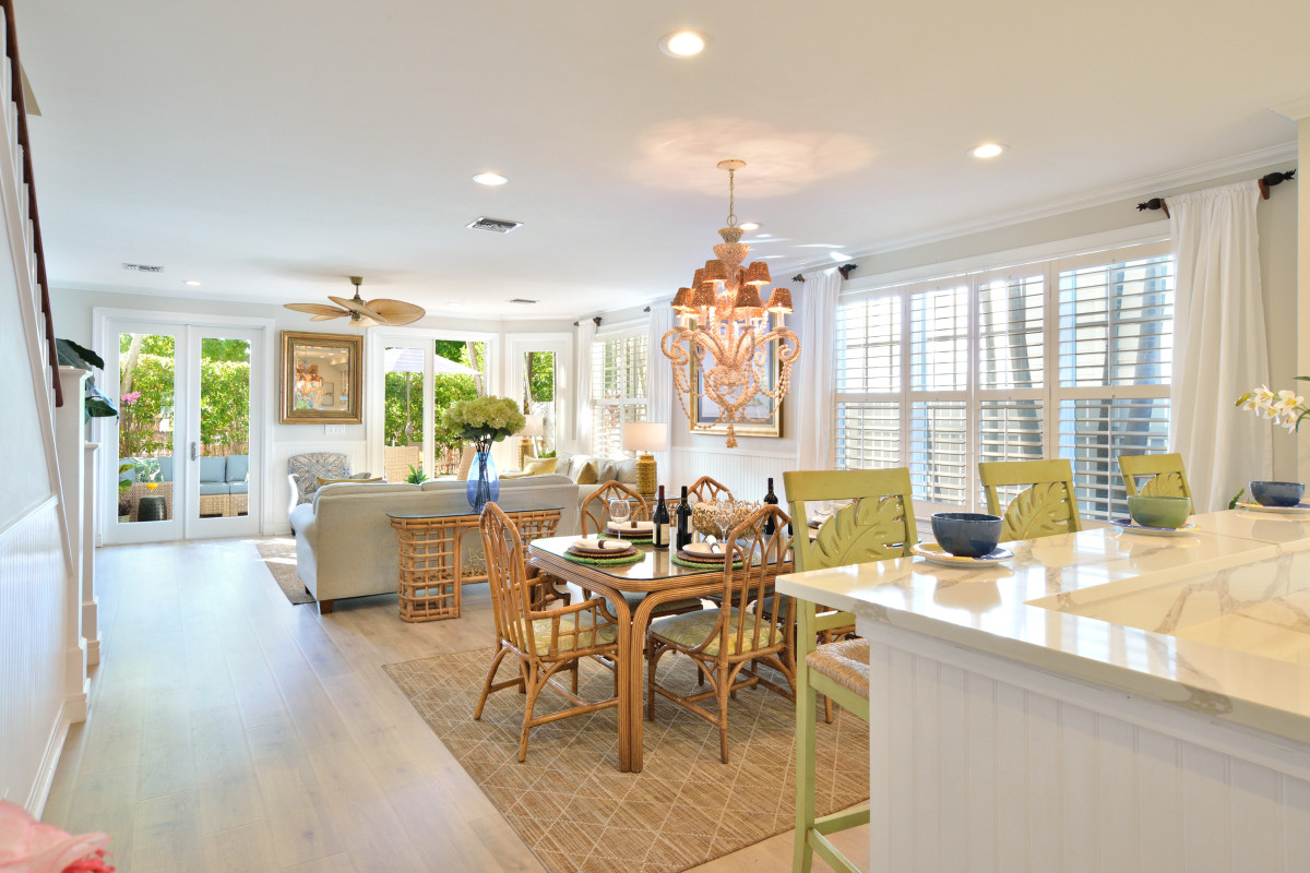 A bamboo bentwood dining table and chairs, topped with an elaborate seashell chandelier, is situated behind the breakfast bar. The dining room sets a tropical tone and creates a natural division between the kitchen and the living room.