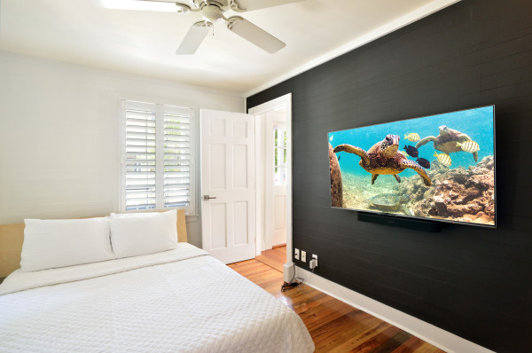 As you step through the front door into the great room, you’ll be taken by the skillful blending of clean modern lines within this historic Key West cottage. The tall wood-paneled ceiling with bright white open beams creates a sense of openness and makes the room feel larger. The sense of openness is amplified by the plentiful outdoor views afforded by the many windows and glass doors which wrap around the room. Tasteful, clean contemporary furnishings include a queen sleeper sofa. The two large double French doors on the wall to your left seamlessly merge the room with the swimming pool garden. The garden is made to feel private with lush tropical foliage.