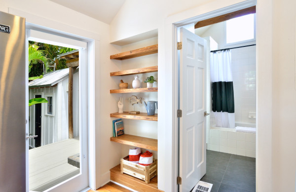 On the opposite wall from the kitchen is the entrance to the master bath. Under its vaulted ceiling, you’ll find the bathtub complete with rain shower head, and ample closet space. In its own closet, you’ll find a Frigidaire washer/dryer stack. Step through the frosted glass French door, and you’re under a shady little lanai which opens onto the back deck. Here you’ll spot a table and chairs for luxurious dining under the stars, and also an open shower stall, handy for rinsing off after a swim.