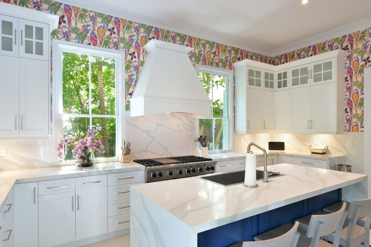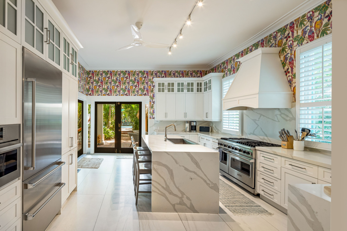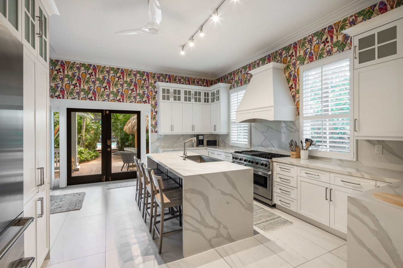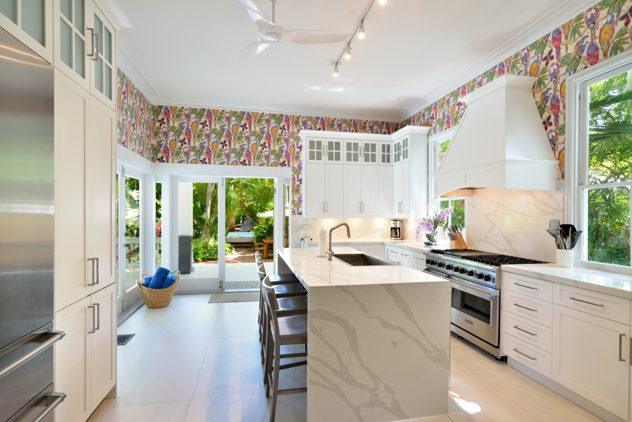 Designer Kitchen: The kitchen adjoins the dining Encompassing the entire back of the house, the kitchen is synonymous with a bold contemporary design in a luxury cooking environment. Unexpected combinations of patterns, colors and textures include spectacular Neolith Calacatta quartz surfaces, and bright white cabinets with window pane tops set in striking contrast to bright red, yellow, and cobalt blue parrot patterned wall paper. Two sash windows over the kitchen counter plus two sets of single pane French doors provide multiple views of the expansive wooden deck and lush tropical pool-garden in the back yard.