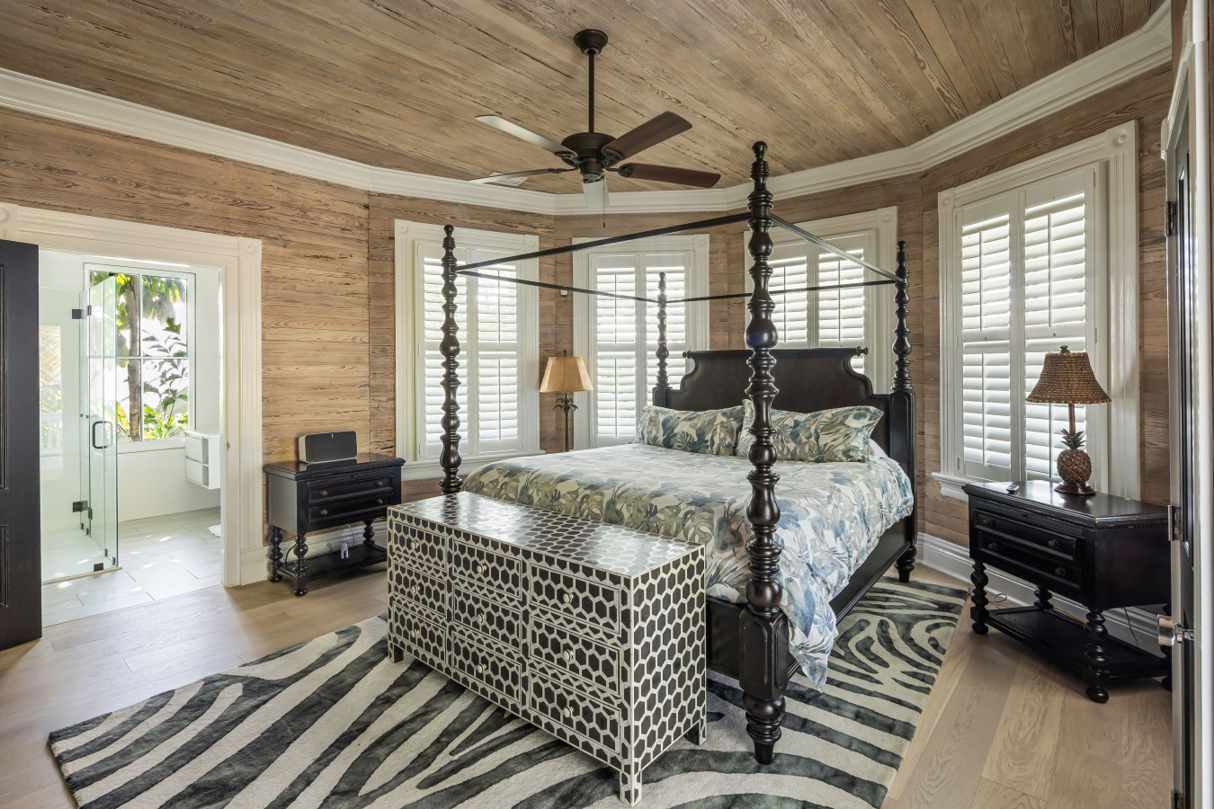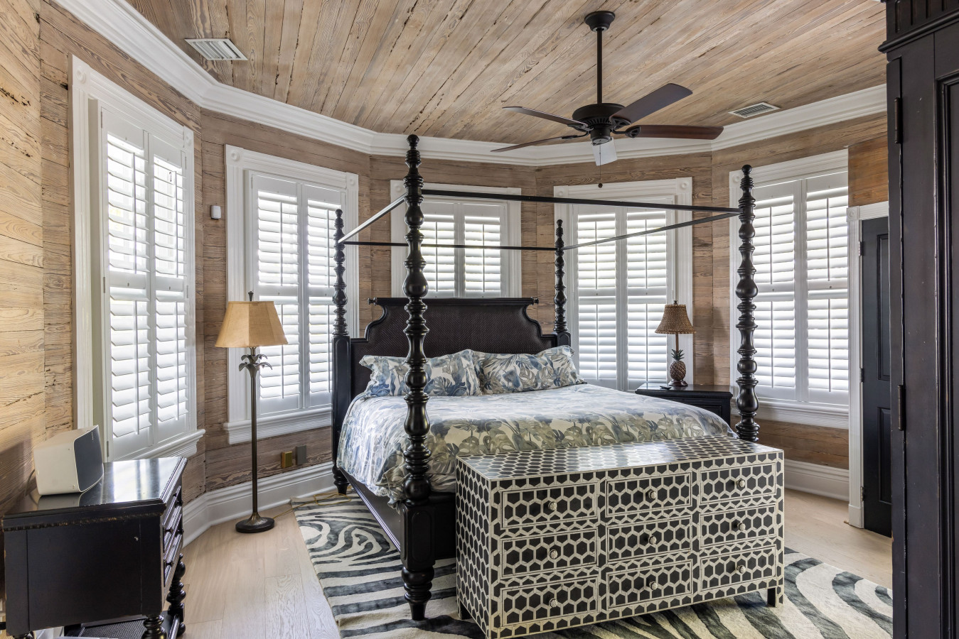 Master Bedroom with En-Suite Bathroom (Bedroom Three) – found immediately on the left and Bedroom Four at the end of the hall. If you want to sleep in the unique octagon space, make your bid for the master bedroom on the 2nd floor. An exotic black and white scene is created using dark wood furniture with a lathe turned 4-poster King size bed and William and Mary style side tables, set against the bleached bare-wood walls and white trim that remain from Donghia’s timeless restoration. With the dark headboard at the center window, the bed is gently enveloped by the five-sided white trimmed windows. A large armoire holds a 43-inch TV. An intricate and stunning black and white Indian honeycomb pattern chest placed at the foot of the bed and a faux zebra rug create a chic ambiance and complete the room.