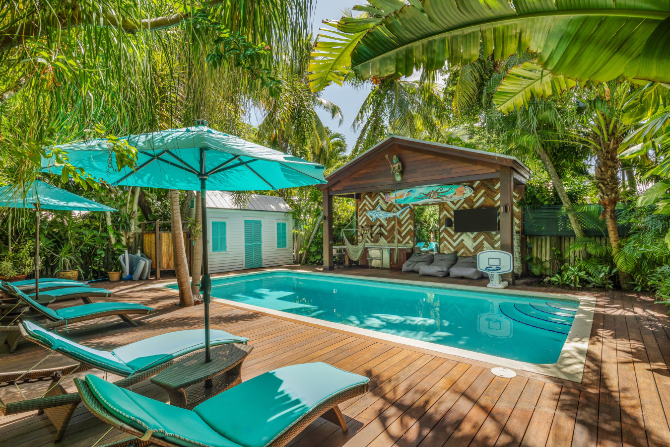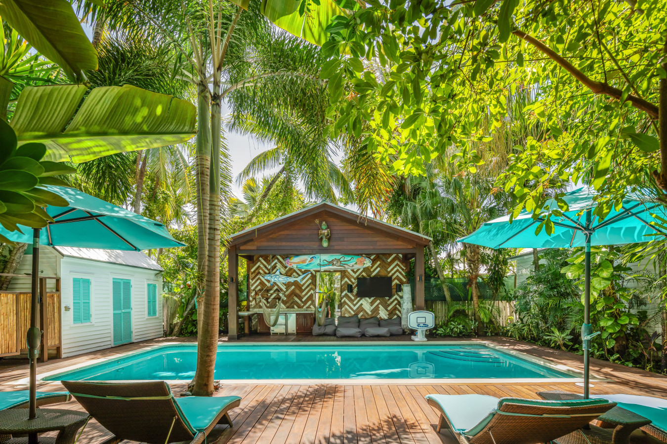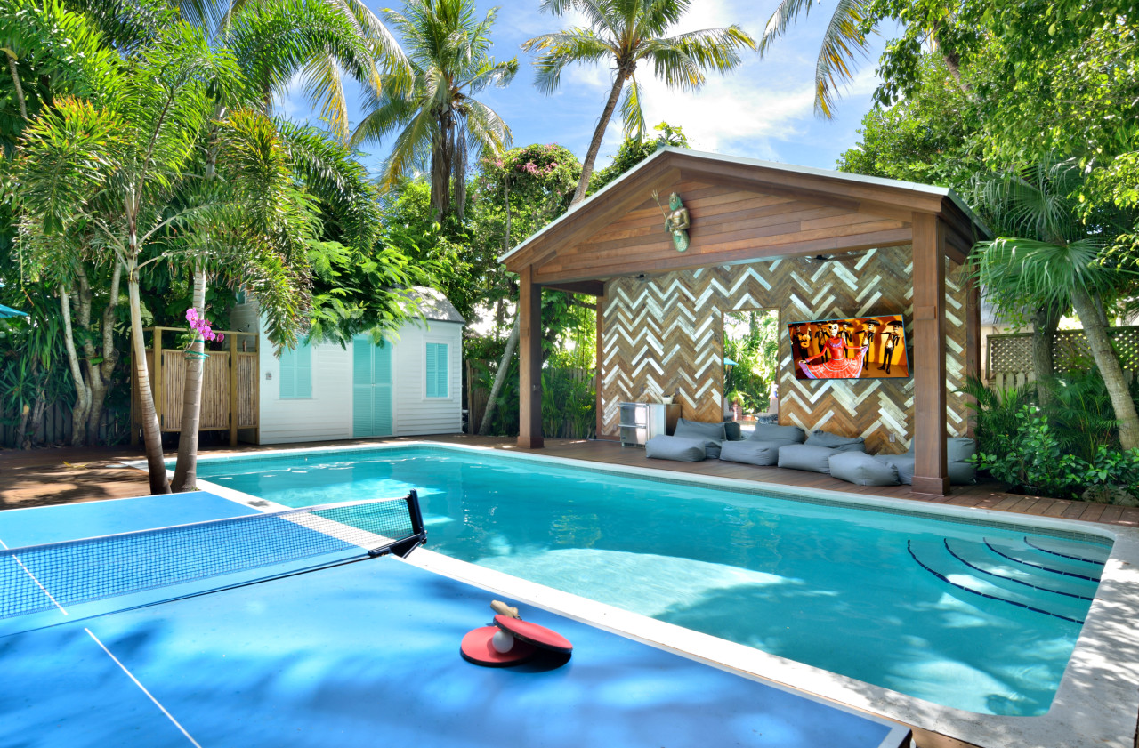 The poolside area is staged for outdoor recreation with a large wooden pagoda, built along one side of the pool. Under the roof, the pagoda is staged with cushy club lounge chairs, a stainless-steel ice maker with two beverage cooler drawers, and a large flat-screen TV. On the other side of the pool, the deck is set with chaise lounges, sun umbrellas, and a full-size ping pong table. Then, at the back of the pool an adorable white cottage with Caribbean blue shutters was transformed into a poolside bathroom with sink and commode. Next to the bathroom cottage, is an outdoor shower.
