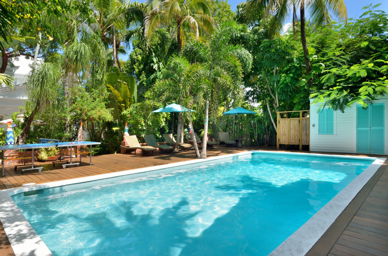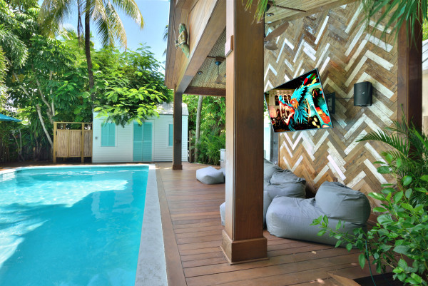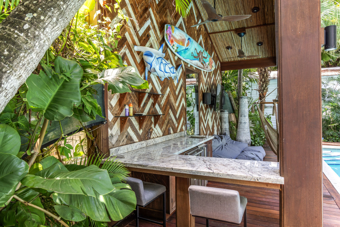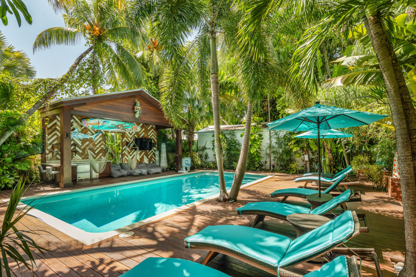 The poolside area is staged for outdoor recreation with a large wooden pagoda, built along one side of the pool. Under the roof, the pagoda is staged with cushy club lounge chairs, a stainless-steel ice maker with two beverage cooler drawers, and a large flat-screen TV. On the other side of the pool, the deck is set with chaise lounges, sun umbrellas, and a full-size ping pong table. Then, at the back of the pool an adorable white cottage with Caribbean blue shutters was transformed into a poolside bathroom with sink and commode. Next to the bathroom cottage, is an outdoor shower.