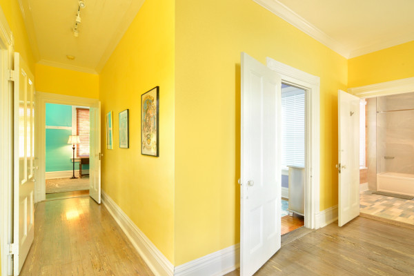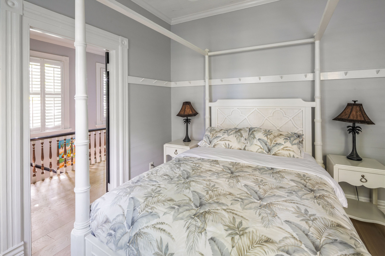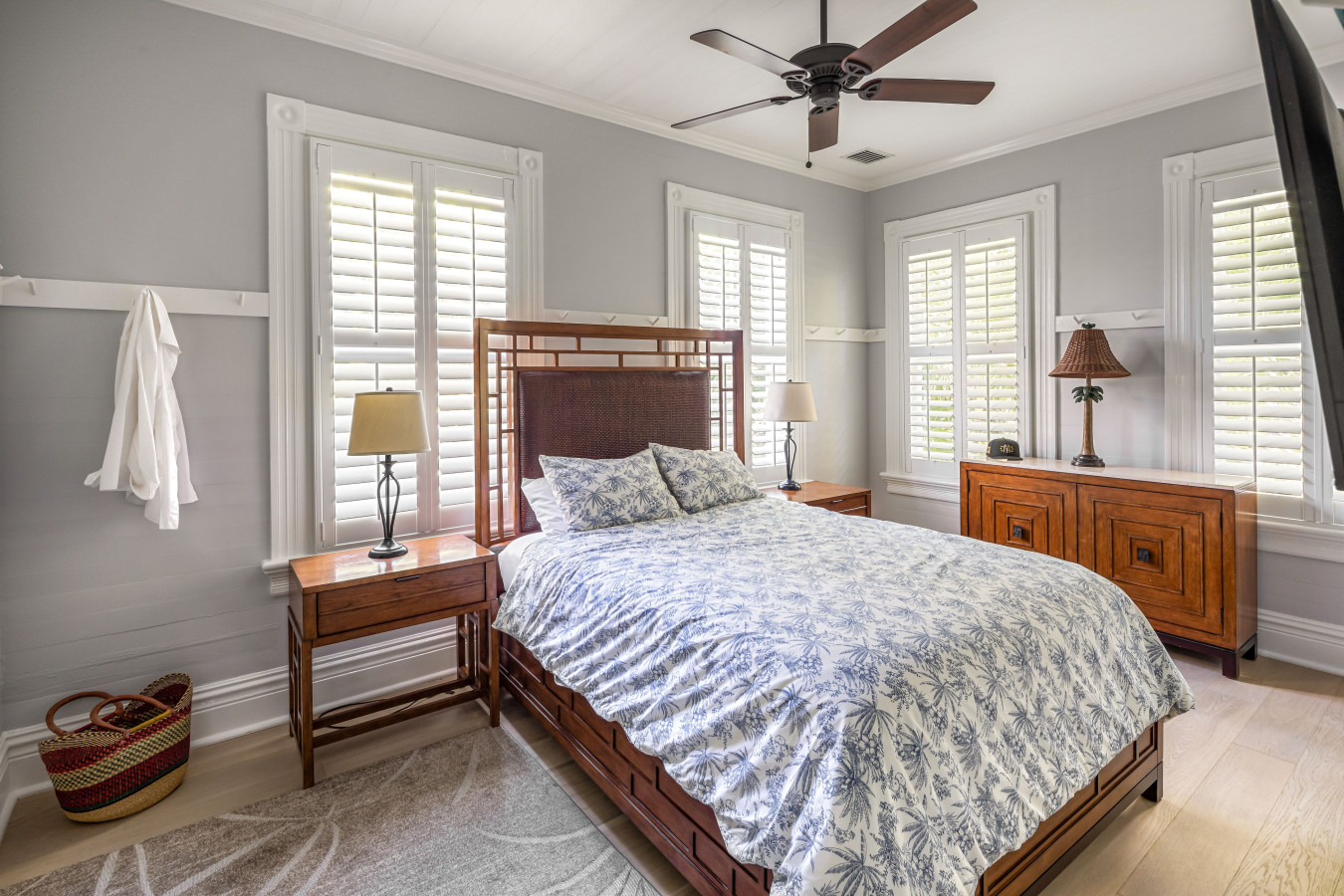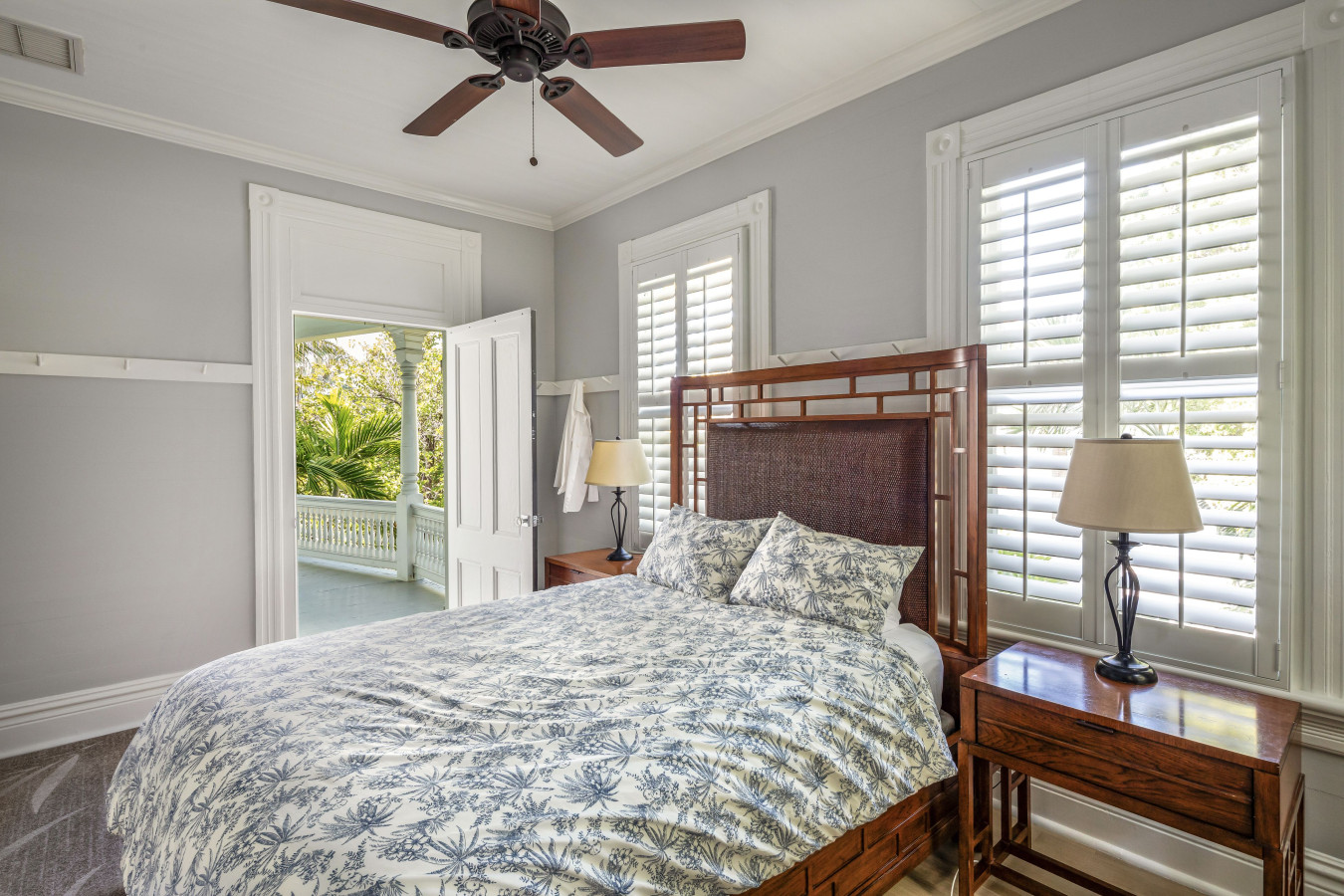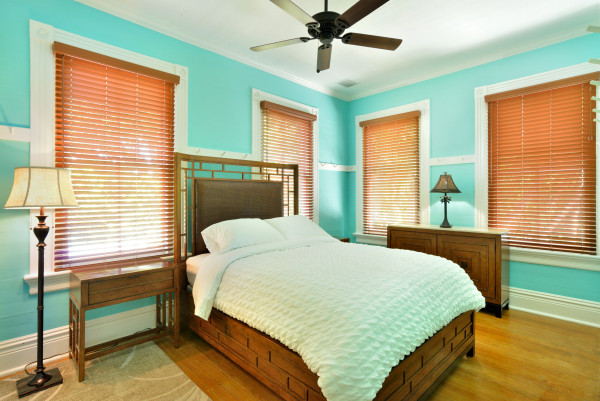 Bedroom Four: Situated at the end of the 2nd floor hallway, this bedroom is painted in energetic Caribbean blue with a sand-tone rug. In contrast, walnut tone wooden furniture, including the queen size bed, take a calming South Asian flare lending the room its own exotic feel. The original closet is in place for hanging clothes. This bedroom also has the special feature of a private door that leads directly to the 2nd floor verandah overlooking the front and side garden.