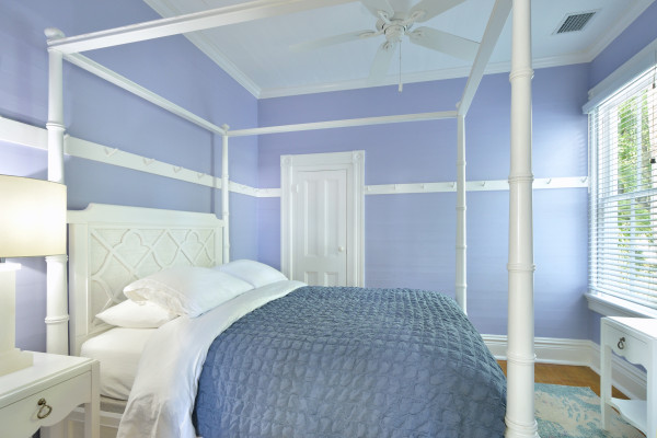 Bedroom Two: Returning to the front entrance hall, our tour now goes upstairs to the 2nd floor to view three more bedrooms and two bathrooms. At the top landing, look straight ahead, then to your left to find the entrance to bedroom two. We find more awesome color used in this bedroom, with original pine wood walls painted a striking lavender with white ceilings and trim. Furnished with upscale bright white contemporary colonial furnishings, this bedroom provides a queen size 4-poster bed with matching headboard and bedside tables. A full-size abstract rug on the wood floor carries on the tropical ocean theme with images of lobsters and coral. Two sash windows look out toward the garden and the 1st floor roof and bring in the sunlight.