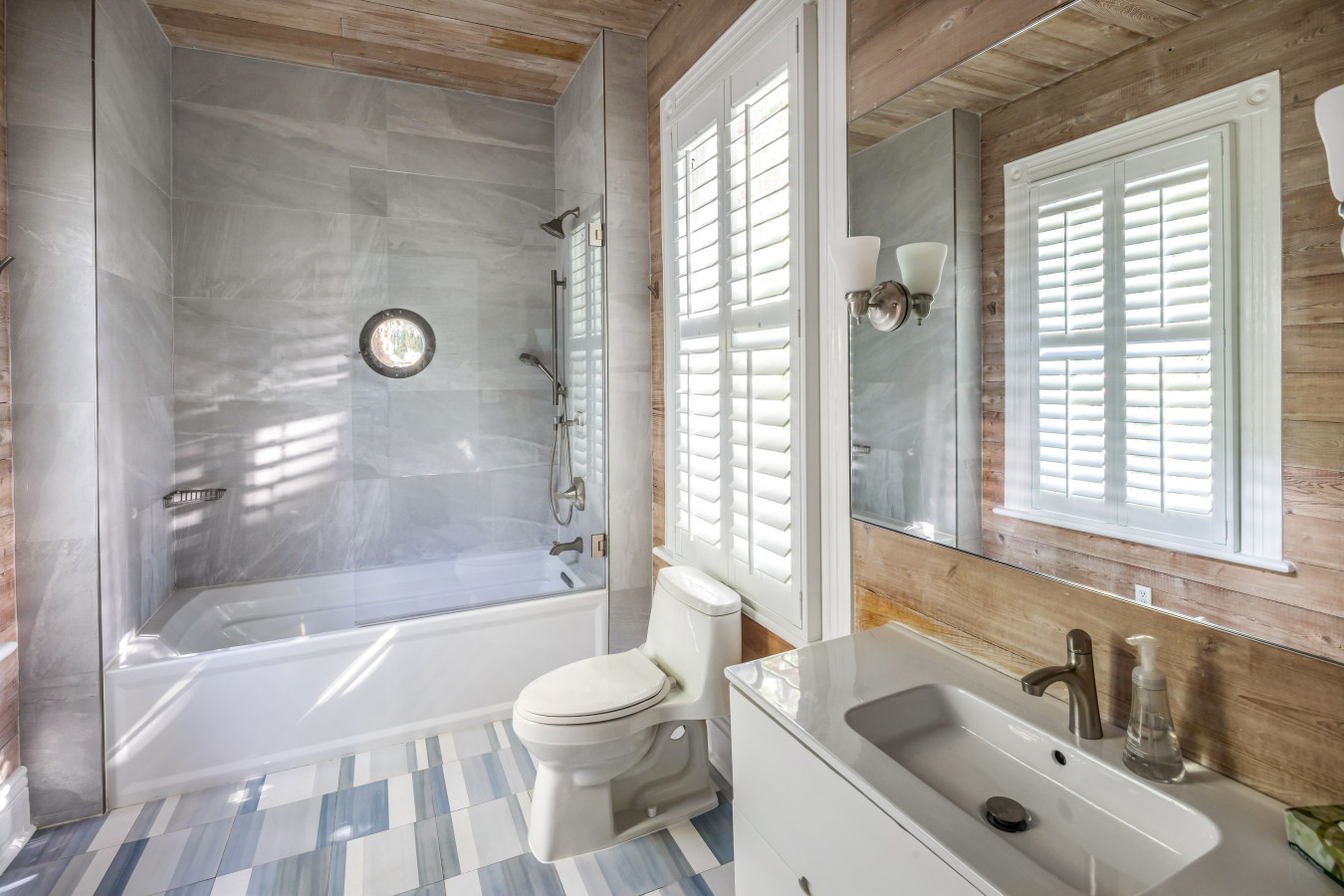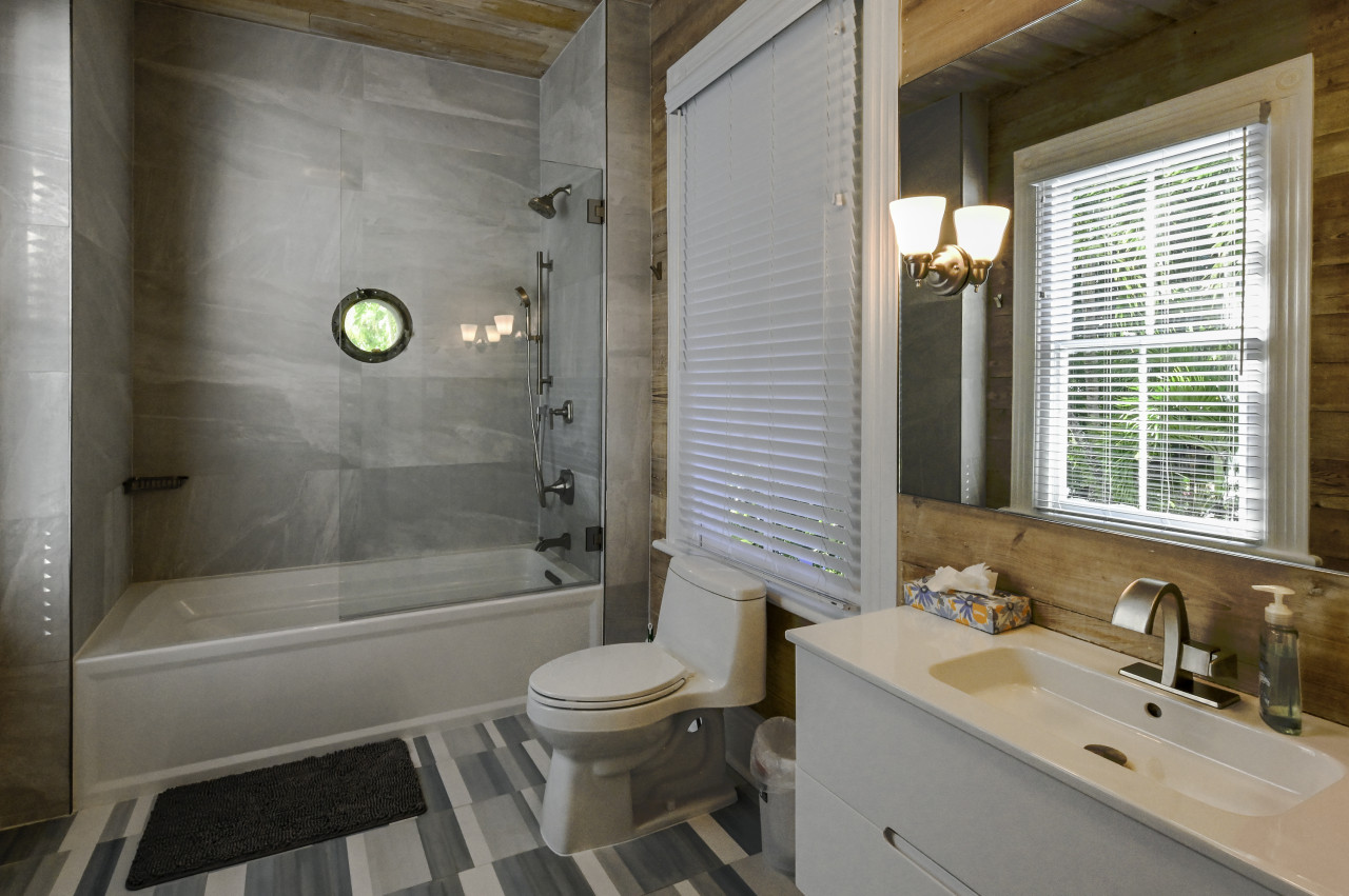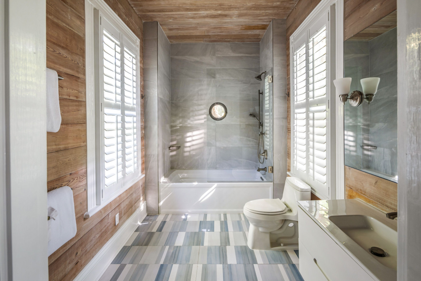 Bathroom Two (Shared Bathroom) – Directly outside Bedroom Two just a few steps away from the door, is a full bathroom. This bathroom is also shared with Bedroom Four just around the corner at the end of the hallway. A white modern vanity with molded sink, bare bleached wood walls and ceiling, and floor subway tiles of soft blue, gray, and white. A full-size bathtub and in-tub shower walls are tiled with large faux light gray-white marble bath tiles. A surprise artistic feature is a ships-portal window set in the in the shower wall.