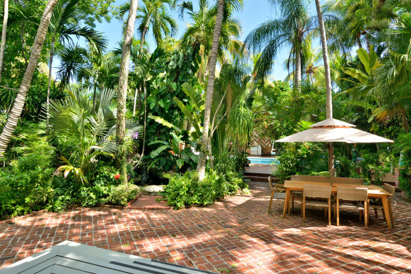 Front and Side: A quintessential white picket fence completes the romantic tropical setting in the front garden, while lushly landscaped grounds and privacy fencing continue down both sides of the property all the way around to the back. On the east side of the property, there is a bricked driveway for off-street parking.