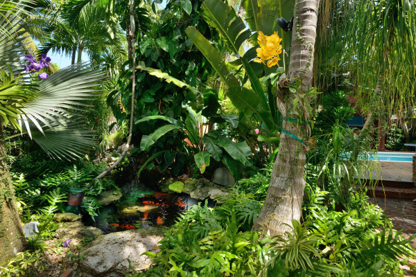 Back Yard: A phenomenal paradise, the expansive back yard feels like a small private luxury resort with attention to absolutely every detail! Much of it is covered with beautiful brick pathways winding through exotic garden spots planted with a large variety of mature tropical trees, palms, and beautiful flowers. One garden spot features a trickling waterfall that spills into a koi pond. An outdoor dining table is perfectly placed in the garden, not far from the back porch.