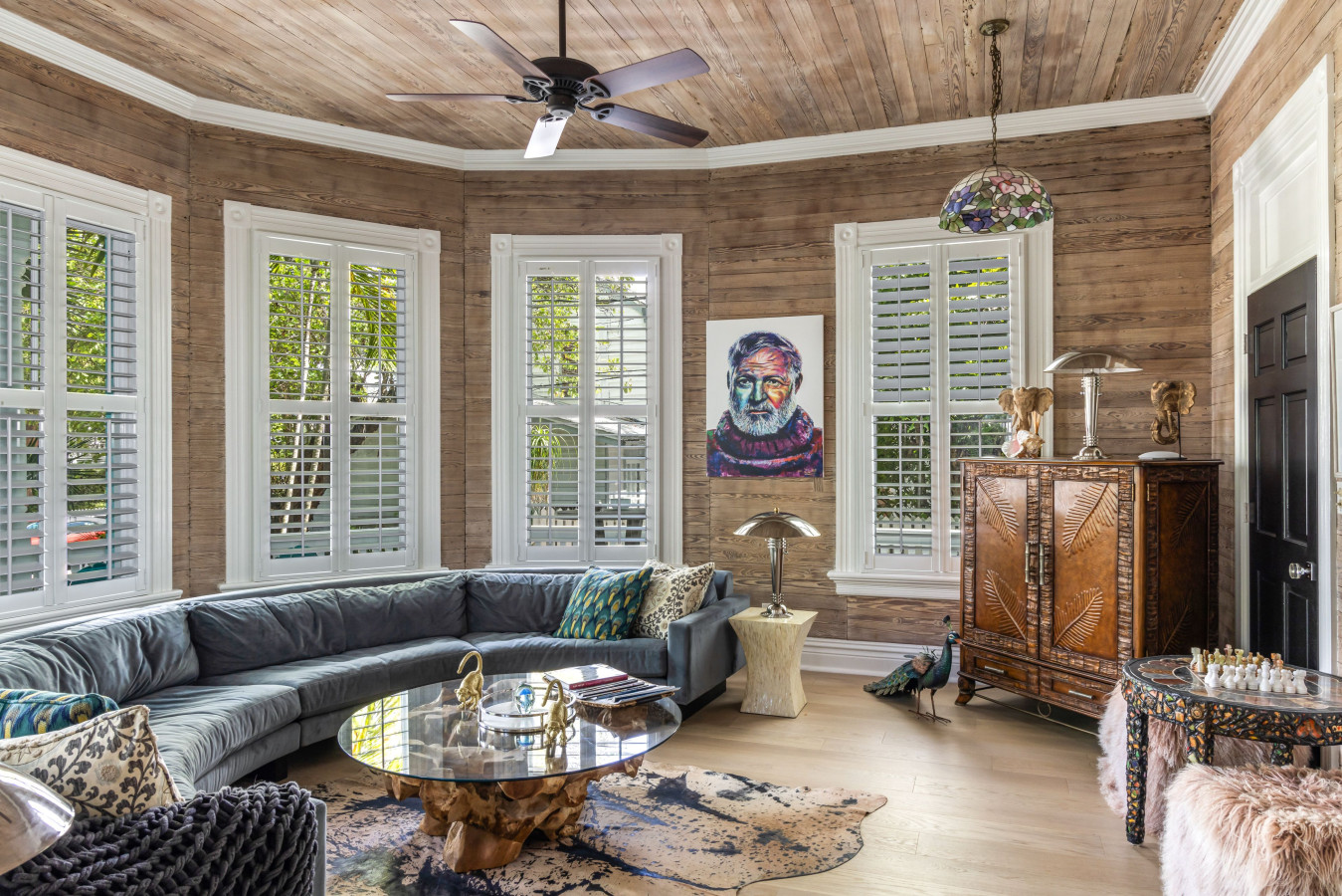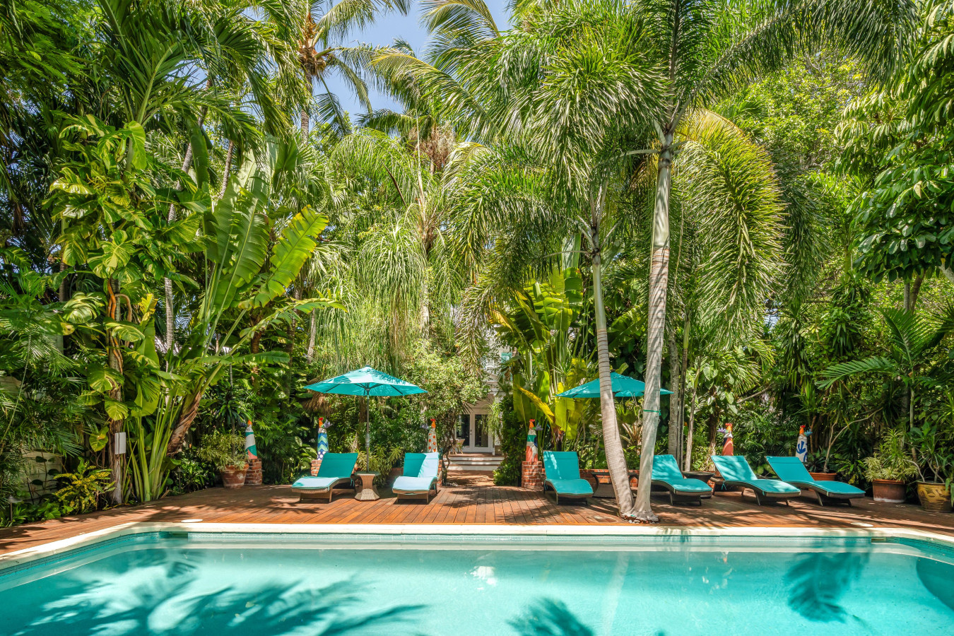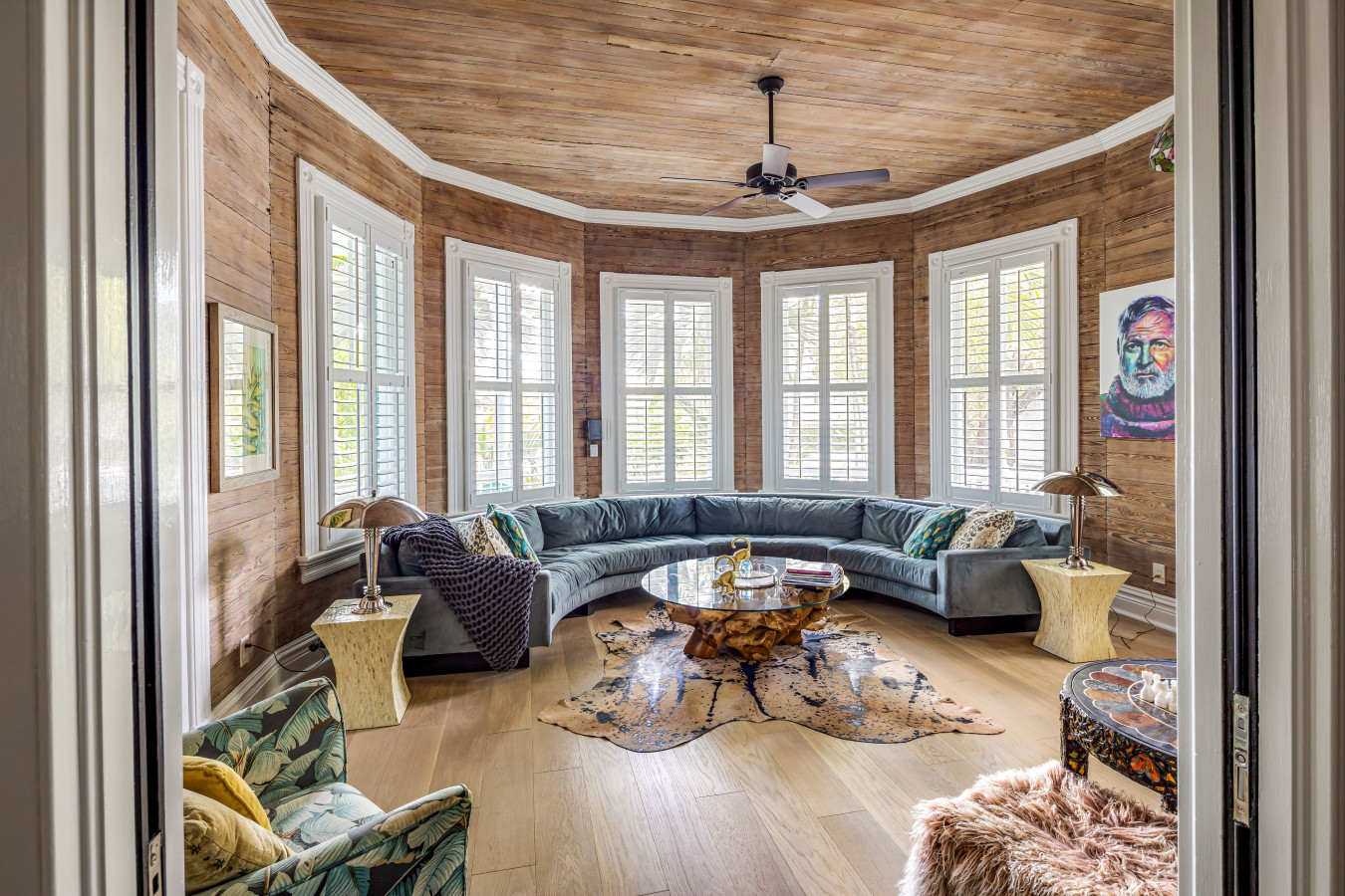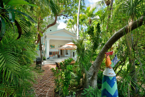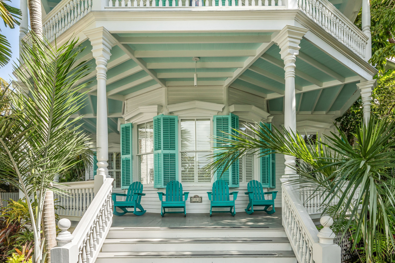 As you enter the garden gate, the bright turquoise shutters on the house captivate your attention, and your eye is naturally drawn to the center of the octagon porch to find the front entrance. But before we step inside to take our tour, take a moment to admire the lush tropical gardens, the proportioned five-sided porch details, and matching blue Adirondack rocking chairs that will tempt you to stop here and simply relax into the beauty of the surroundings.