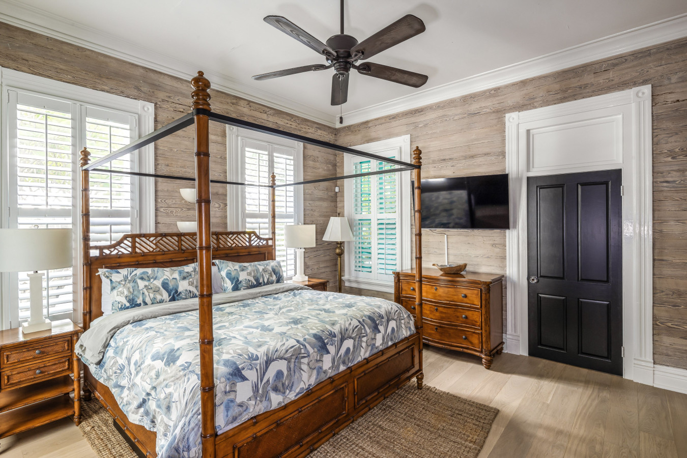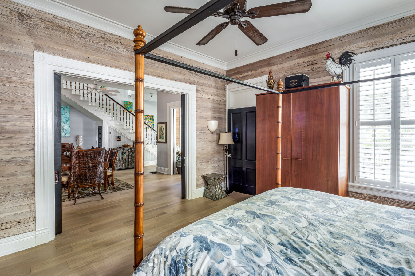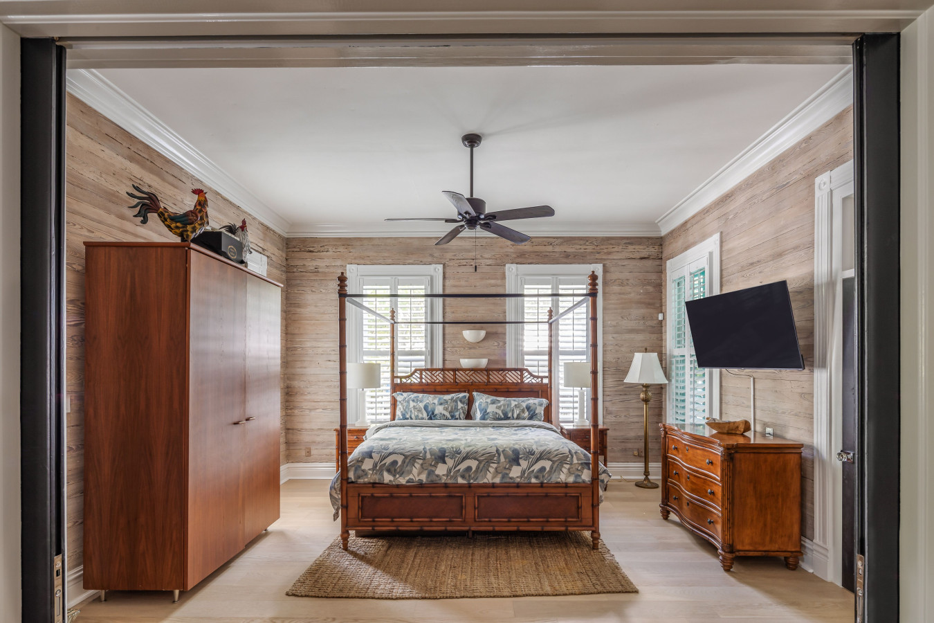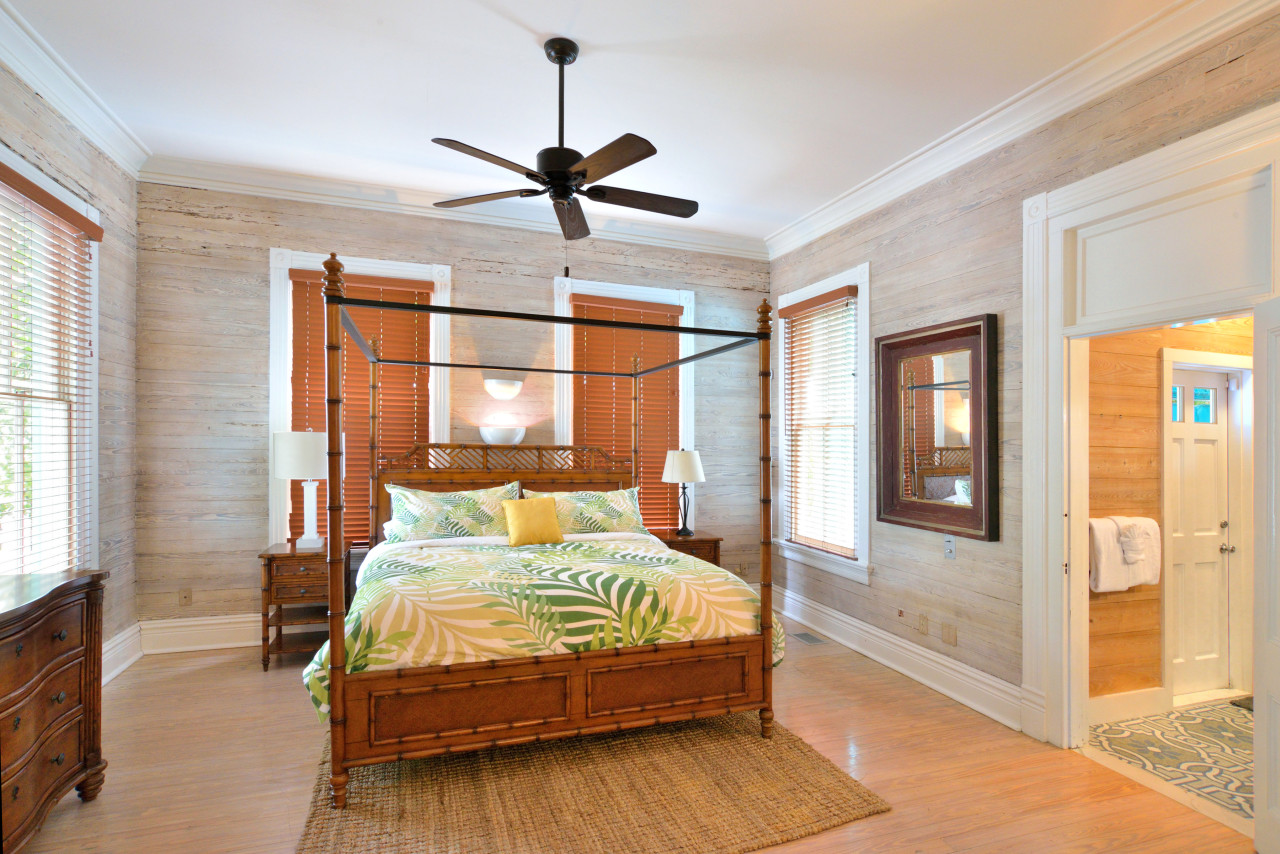 First Floor Bedroom with En-Suite Bathroom (Bedroom One): The spacious 1st floor bedroom, has two access points. The main door connects though the wide dining room arch, with double pocket doors and a 2nd door adjoins the living room. Upscale tropical furnishings include a honey-tone king size 4-poster bamboo-wood and wicker bed with matching dresser and side tables, armoire and a sisal rug to add natural texture to the floor.