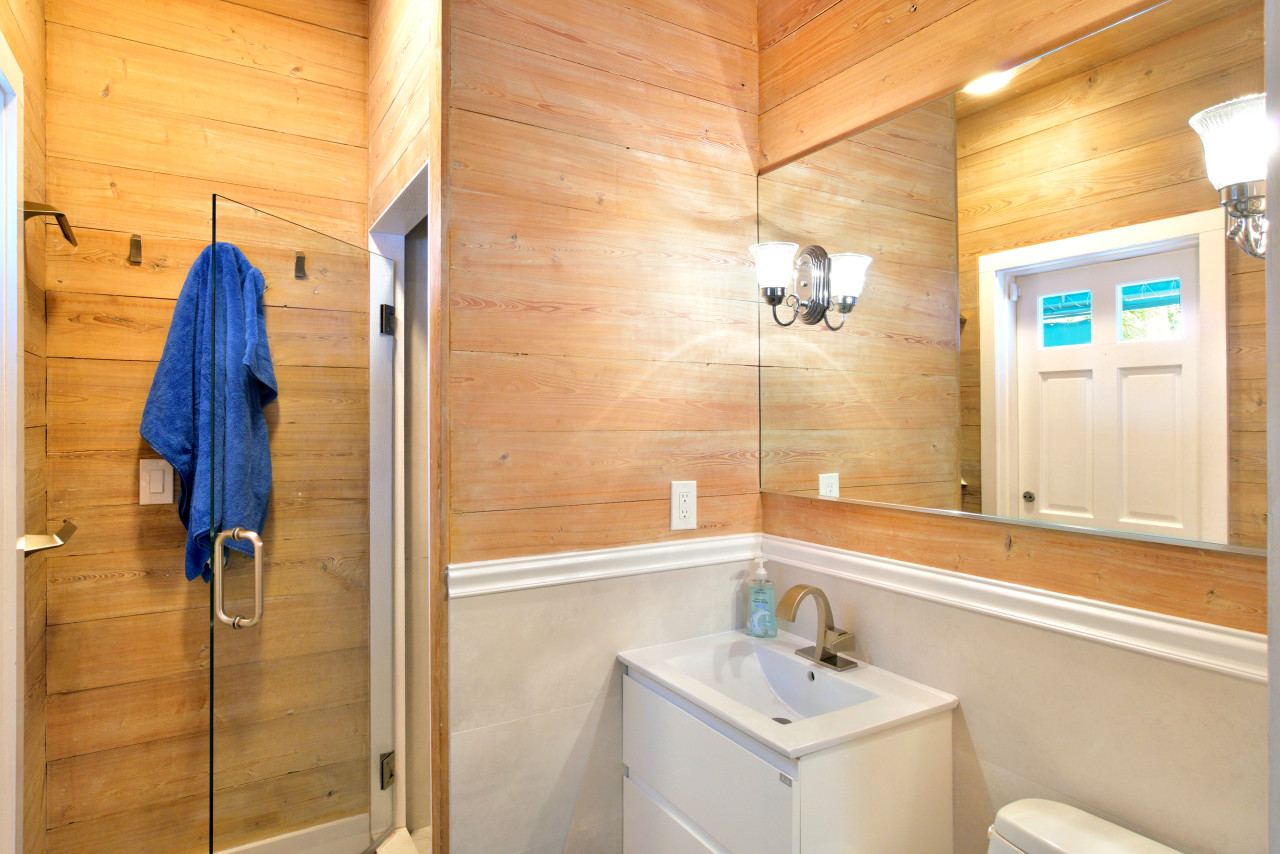 The en-suite bathroom is in sync with the calming influence of the bedroom. Beautiful bleached bare-wood walls and white tile wainscoting behind the floating white vanity with modern molded square sink create a spa-like feel. A tiled step-in shower closes with a frameless glass door. Another nice feature is a door that conveniently leads outside to the back covered porch – ideal when you want to throw on your suit and go right out to the swimming pool.