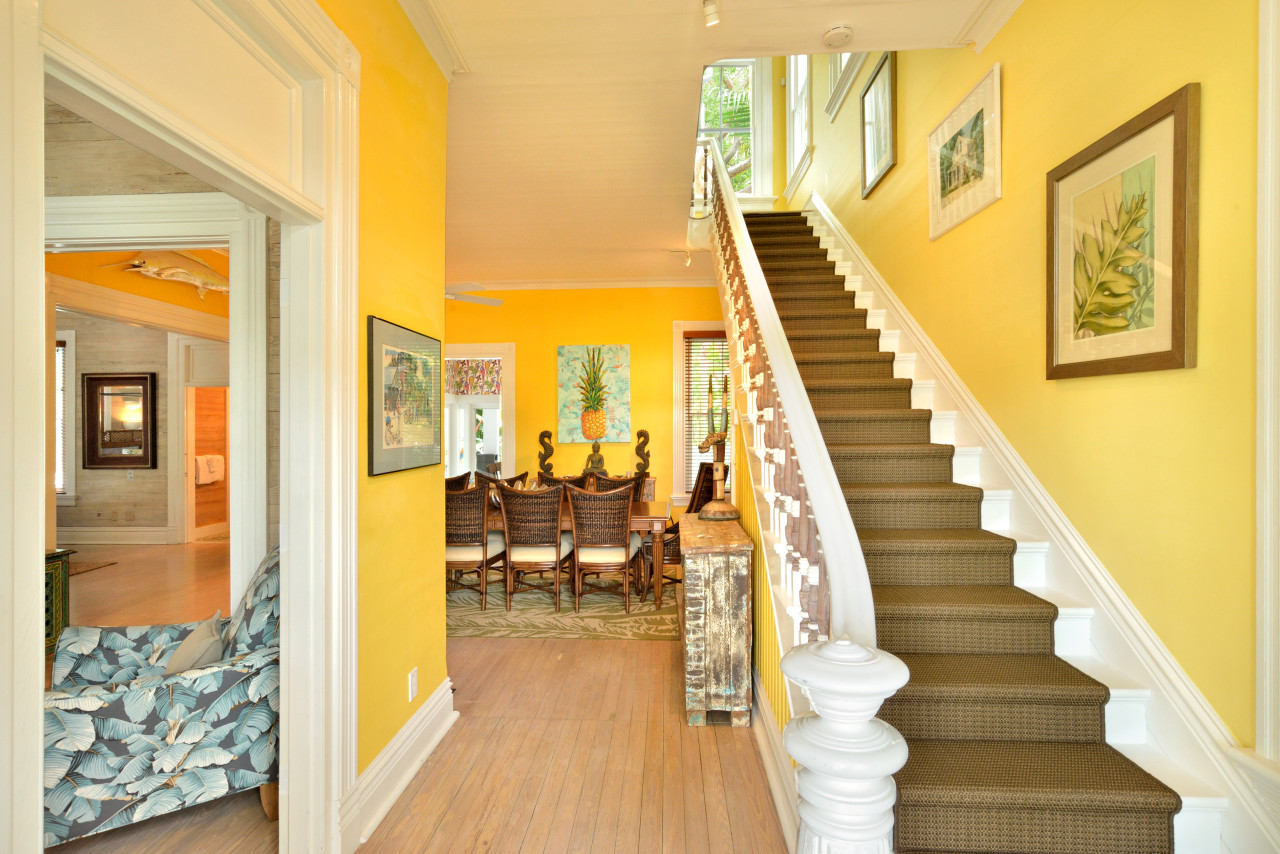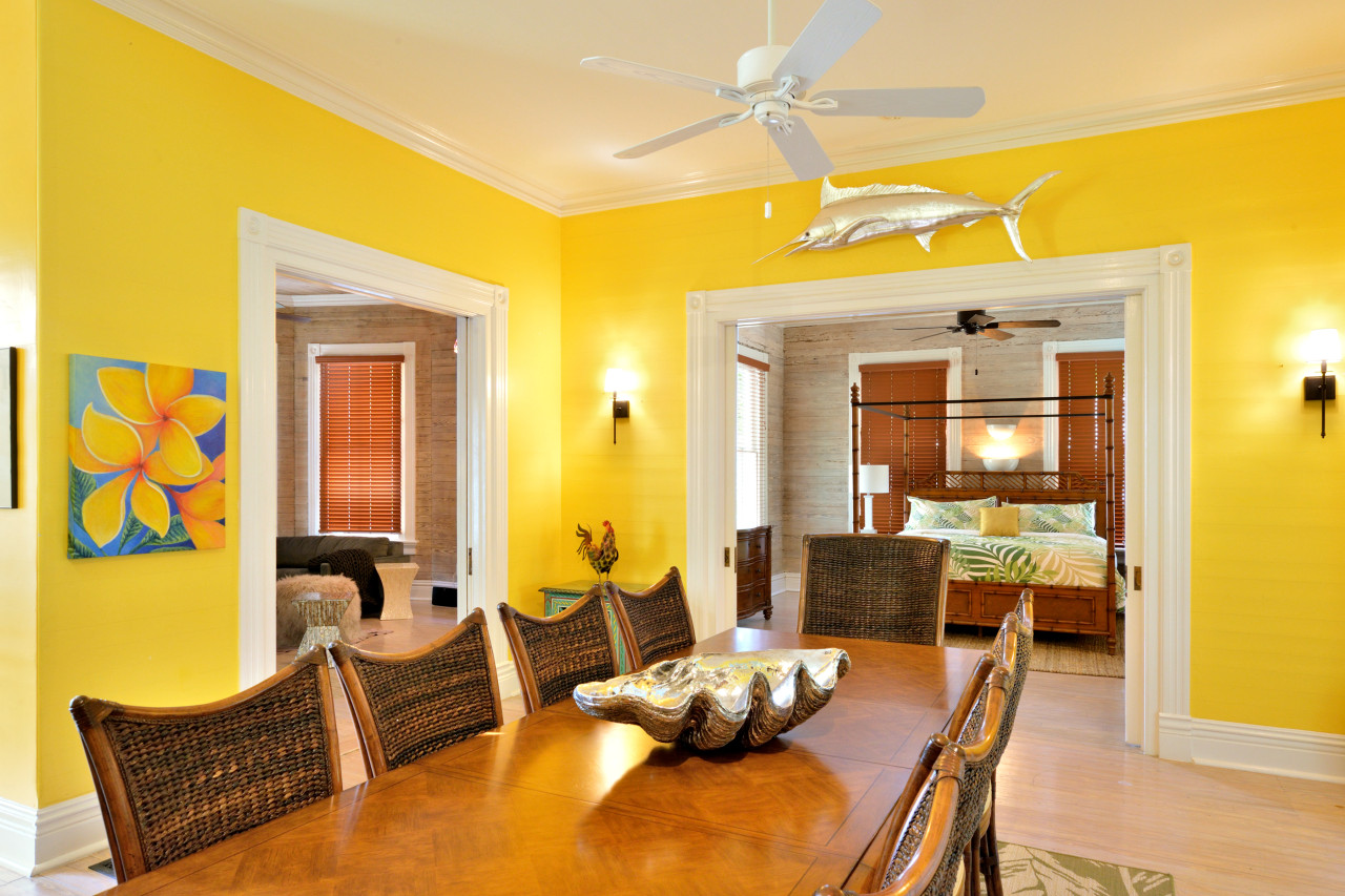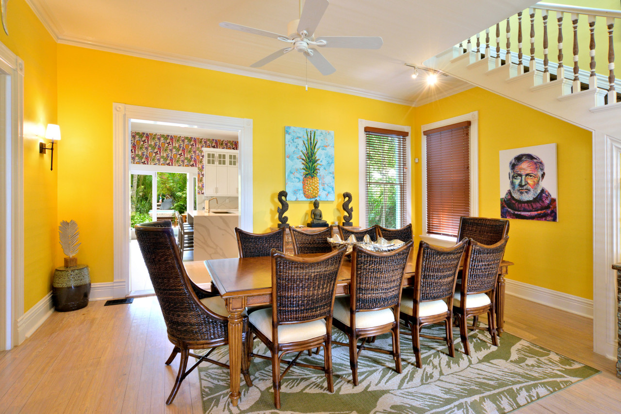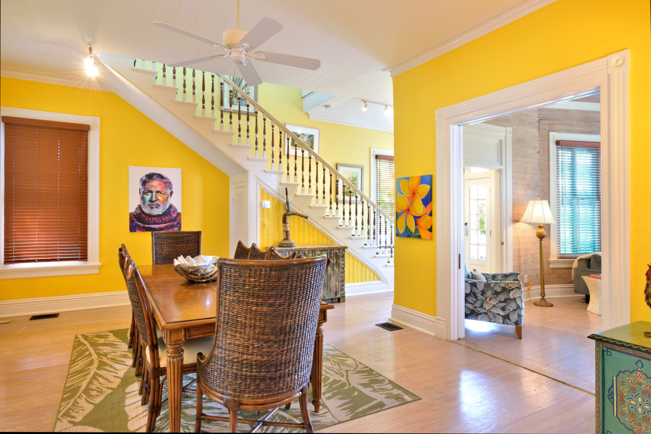 Entrance Hall and Dining Room: When you step inside, the 12-foot ceilings and tall arches with crown molding are immediately uplifting. Next, notice how the entrance hall features a classic Victorian staircase leading to the 2nd floor, creating a stately ambience. Always an intriguing feature in the grand centurion Key West Victorians, this staircase is elegant, curving out at the bottom. Except for the spindles, all woodwork is painted white, in traditional contrast to the bold yellow painted walls of the entrance way.