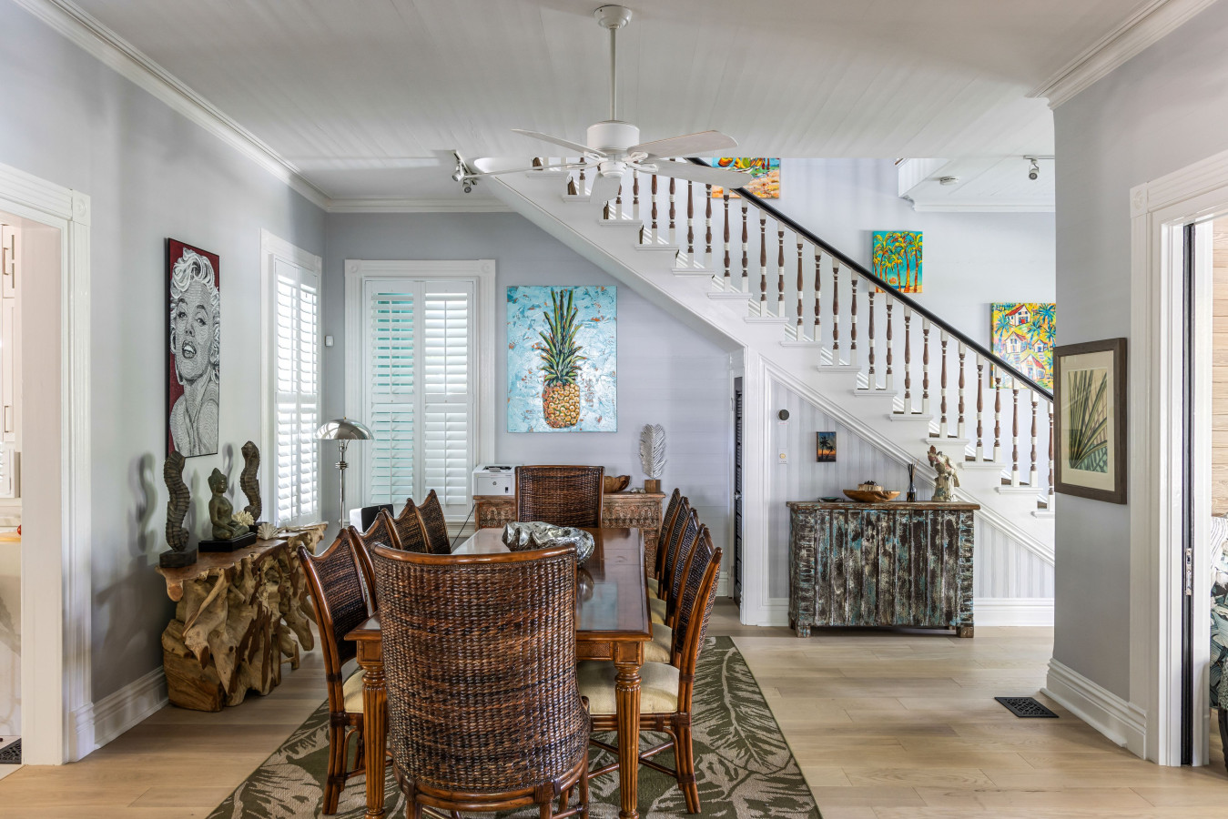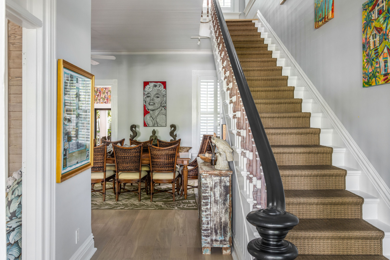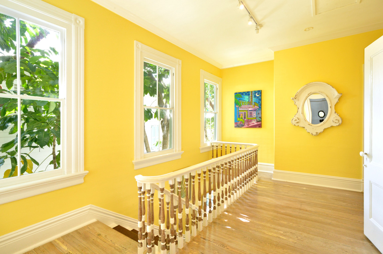 Entrance Hall and Dining Room: When you step inside, the 12-foot ceilings and tall arches with crown molding are immediately uplifting. Next, notice how the entrance hall features a classic Victorian staircase leading to the 2nd floor, creating a stately ambience. Always an intriguing feature in the grand centurion Key West Victorians, this staircase is elegant, curving out at the bottom. Except for the spindles, all woodwork is painted white, in traditional contrast to the bold yellow painted walls of the entrance way.