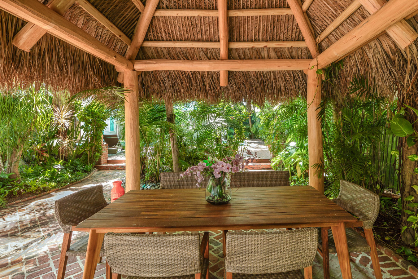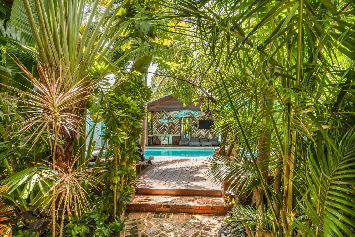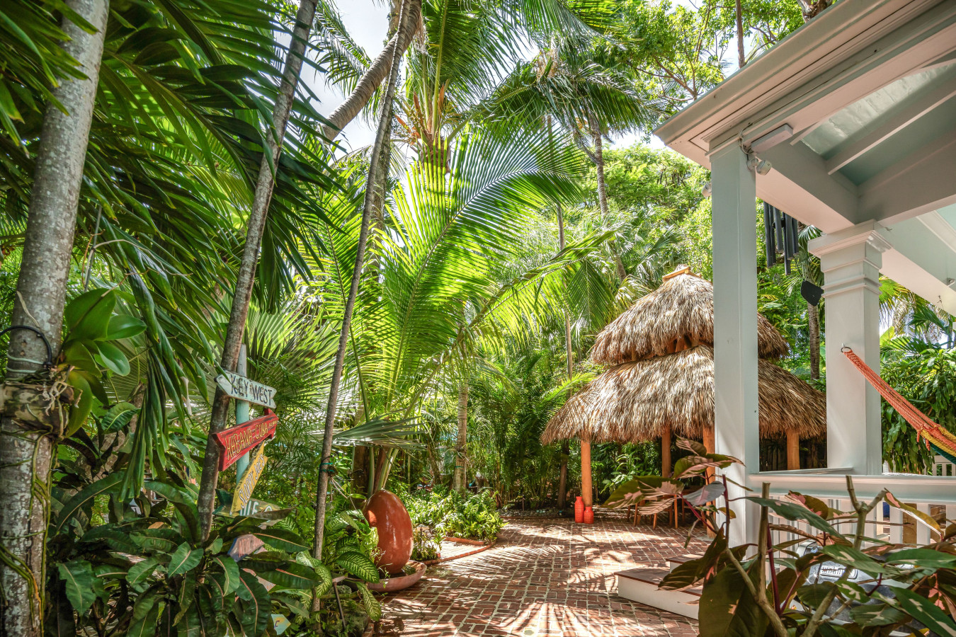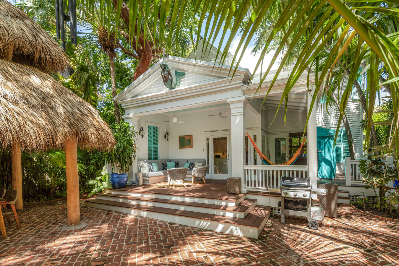 In the back of the house, an expansive covered porch adjoins the kitchen through two sets of single-pane French doors on two sides of the house. A string hammock is strung on one side of porch when you just want to hang out, and when you’re ready to explore the lush tropical gardens or go to the swimming pool, three sweeping stairs, the length of the porch, unify the back porch with the grand bricked garden.