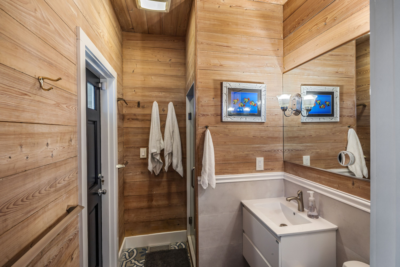 Conveniently not only from the kitchen, the half-bath is easily accessible from the back deck just outside the French door. It’s beautifully decorated with Caribbean blue walls, bright white wainscoting, a floating white sink vanity, and unique gray-tone hexagon floor tiles.