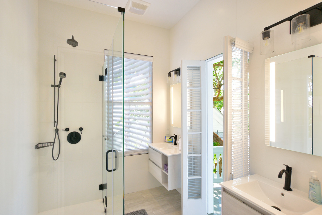 The spectacular en-suite bathroom continues with the black and white monochromatic scheme. The entire large shower is made of frameless glass making it nearly disappear. Two modern gray-wash floating vanities, with lighted mirrors, are placed on either side of a small-scale French door leading to the 2nd floor verandah. Soft gray-wash floor tiles are perfectly matched with the vanities. When you’re done showering, put on a nice robe, and you’re in perfect position to walk out the adjoining French door and sit on the porch to enjoy your morning coffee or an evening glass of wine.