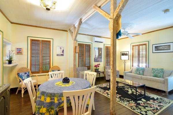The living room is a generous size, with plenty of room to gather. On the side closest to the kitchen, a dining table is placed to create a roomy eating area. The adjoining “butler-pantry” style kitchen is spacious, has a charming French-Caribbean style ambiance, and is fully equipped and easy to cook in.
