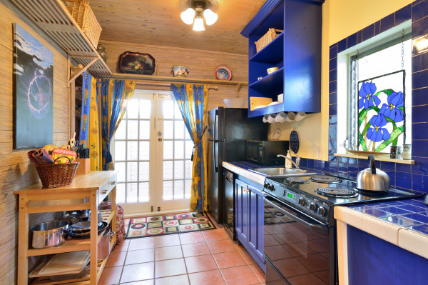 Bedding in this cottage includes a king size bed in the master bedroom, and a queen size bed in the other. The master bedroom boasts a beautiful rich wooden armoire, and French doors lead from the bedroom to a pretty outdoor sitting area for reading and lounging. For extra sleeping, the living room has a comfortable twin daybed.
