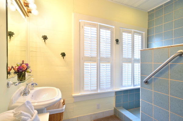 Stroll across the courtyard past the pool to a lattice fence gateway that leads to an entrance of the Caribbean Cottage. This cottage is recently restored and has an authentic Caribbean feel, with original wood planked polished floors, vintage hand-hewned beams, bright blue tile (accented with marble), and Bahama style wooden window shutters. Artist owners painted the original pine walls with elegant historic colors of olive and cream, and adorned the sash style windows with wooden shutters and French linen curtains. Reserved for owner’s use only for many years, original artwork from their private collection is displayed throughout for you to enjoy. cottage is believed to be one of the oldest cottages on the island. The private courtyard with heated pool creates an inviting private outdoor area set in a side yard of the Caribbean Cottage.