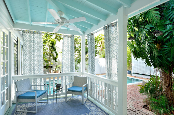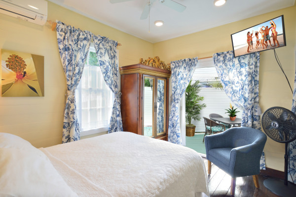 The private courtyard and swimming pool are well hidden just off Upper Duval St. The smaller cottage, also known as the Vintage Luxury Cottage, is an elegant one bedroom cottage that overlooks the swimming pool and courtyard. The interior of this cottage is made to feel spacious with open beamed ceilings, and is decorated and appointed with casual elegance. Tiled throughout with beautiful muted tile, the kitchen is a cooks dream stainless steel appliances, granite counter tops, and even a professional wine cooler under the counter.