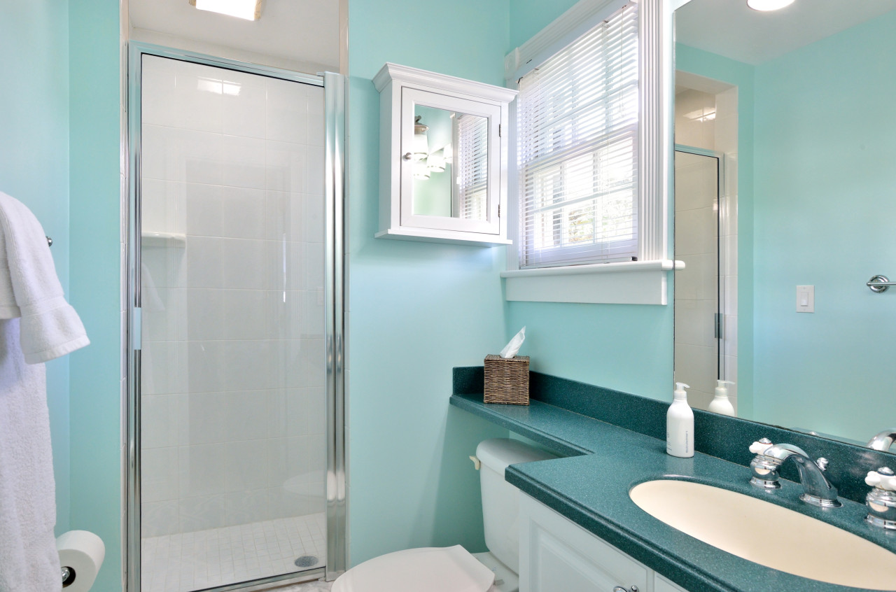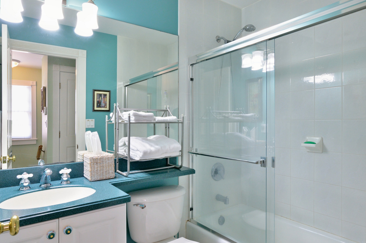 Next, we look at the en-suite master bathroom, accessed on the opposite side of the room from the porch. The white tiled shower with glass door, is double-sized, and there is plenty of vanity space for primping. Keeping the décor consistent with the other bathrooms in the house, it’s built with a teal blue vanity top and walls are painted a soft turquoise and trimmed in white.