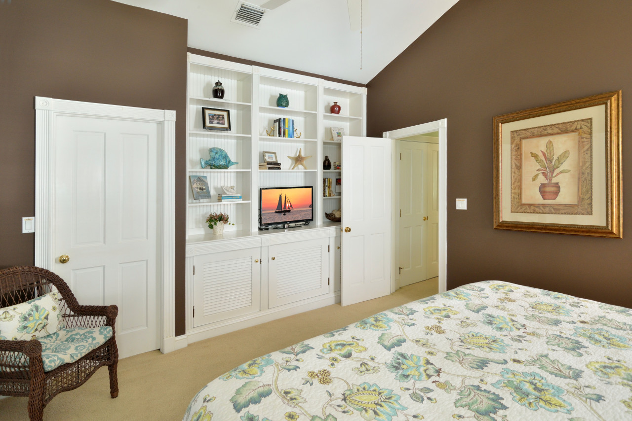 Master Suite: The spacious master suite which encompasses the entire back of the 2nd floor. We affectionately call this the ‘Coco Bedroom’ because of the rich brown color of the walls. With plenty of room, the master bedroom provides a king size bed with seagrass headboard and flanked with dark wooden dressers on each side of the bed. Both are set with reading lamps. A custom floor-to-ceiling wooden cabinet with flat screen TV, is built-in to the wall opposite the bed. Next to the cabinet is a walk-in closet offering ample space for clothes. Sash windows on either side of the bed and the sliding glass door leading to the private closed in porch stream in the daylight.