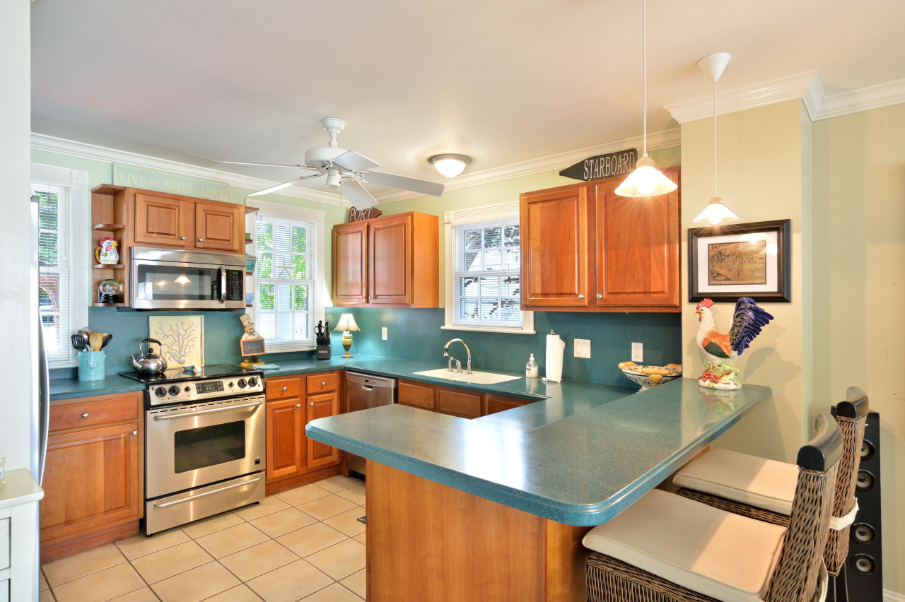 Enjoy outdoor views of the charming front yard and pictorial lane through the three sash kitchen windows. A double level countertop, with pendant lights, spatially divides the kitchen from the dining area. This is a perfect place for breakfast, lunch, or cocktails. Take a seat, and make yourself comfortable, at the two counter-height wicker chairs with backs and seat cushions.