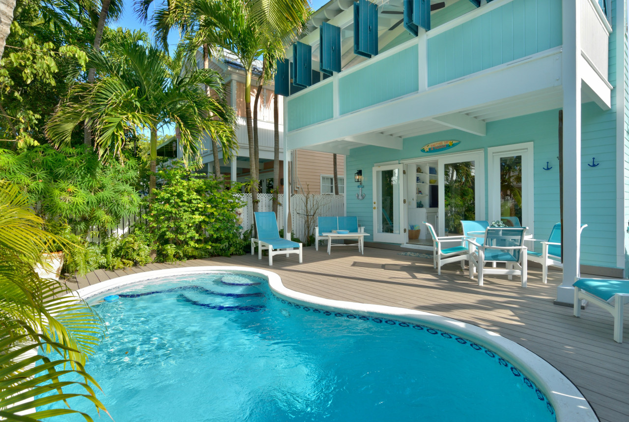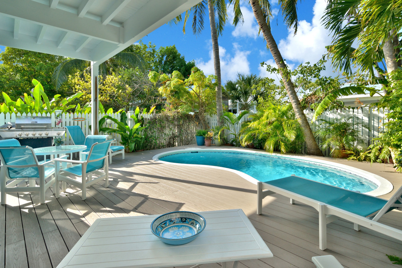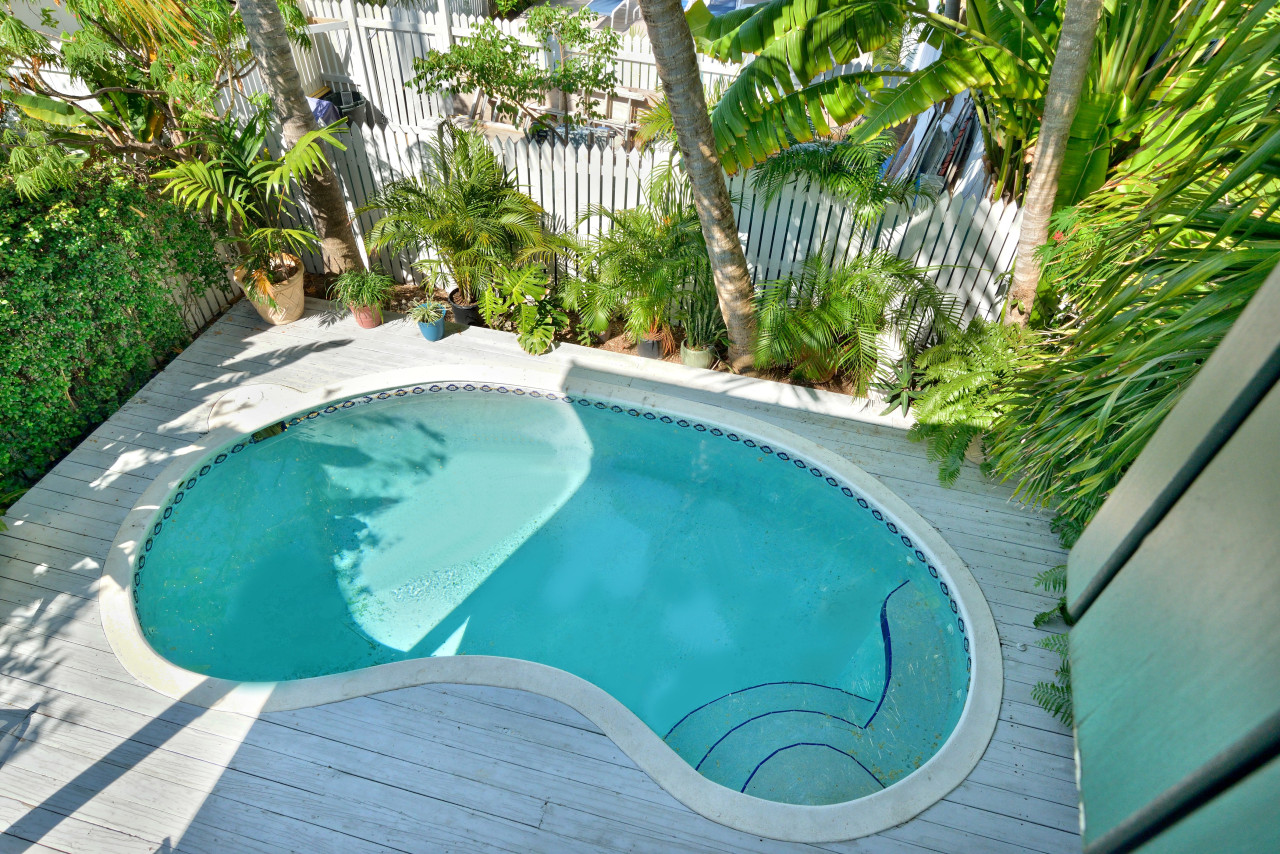 Back of the House: The focal point of the back yard, is the free-form swimming pool and expansive deck. The 2nd floor closed in porch provides a roof over part of the deck, creating a sun protected space for the dining table and lounge chairs. A manicured display of tropical foliage surrounds the parameter of the back yard and makes the pool scene feel like an island paradise. When I first walked into this idyllic back courtyard, I felt like I was in a little private oasis and couldn’t believe I was a ½ block from Whitehead St., close to the Hemingway Home and Museum.