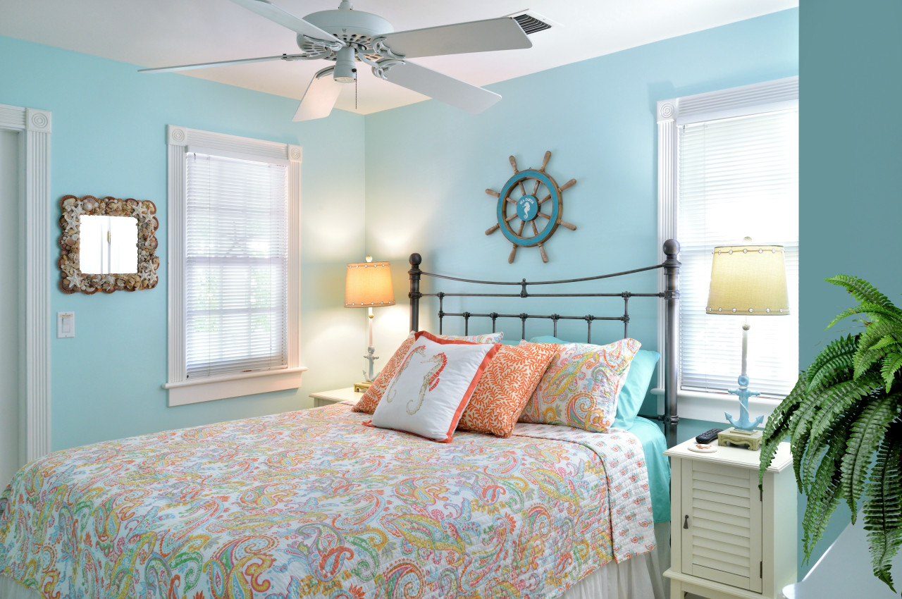 To complete the nautical bedroom theme, the designer painted the walls an ocean blue, and placed playful ship-anchor bedside lamps on white coastal bedside tables. A finishing touch is a handmade seashell framed mirror placed near the door to leading to the covered 2nd floor covered porch, which is shared with bedroom three.