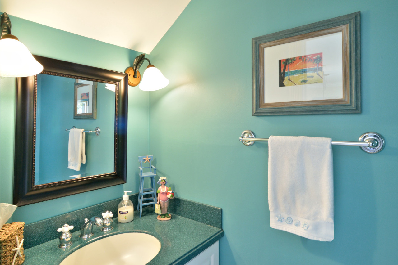 To finish our 1st floor tour, we take-a-peek at the powder room. Even this small space is decorated with a fanciful Caribbean beach-theme. A big splash of color is made by using the same counter found in the kitchen, and bright teal blue walls. Conveniently positioned across from the kitchen, you can see the door handle to the half-bath next to the gray entrance table.