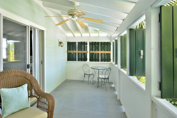 The private closed-in porch runs the entire width of the house and embodies classic Caribbean living. Hinged wooden shutters painted the iconic green, can be open or closed as you wish. Set with wicker easy chairs and a bistro table for morning coffee or 5 pm cocktails, it could also be the perfect place to set up a laptop. From here you also have the birds eye view of the swimming pool garden below.