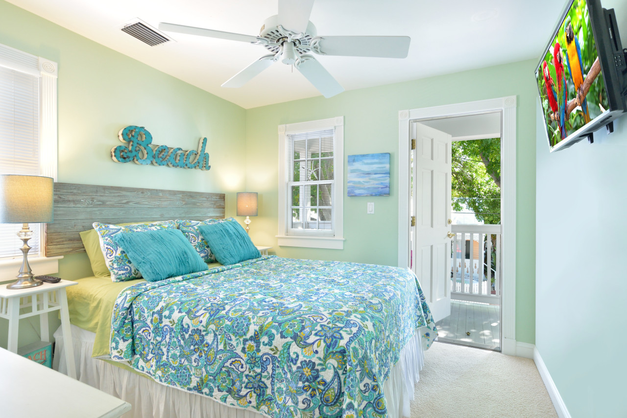 Bedroom Three: Again, the designer’s choice of upbeat art and Caribbean color has created a cheerfully creative bedroom. We nicknamed it ‘The Beach Room’ because of the playful sign above the headboard. Walls painted seafoam green, a headboard crafted of color washed weathered wood, white bedside tables and a round mirror framed with rope all capture the essence of the beach – which is not very far from this house. Opposite the queen size bed, a 40″ flat screen TV is mounted on the wall for easy viewing. A small bureau and standard clothes closet provide hanging and more shelf storage. An abstract painting of the ocean is placed near the door leading to the 2nd floor covered porch.
