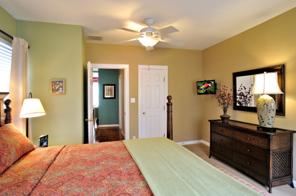 Love Bird Room: A queen-size bed in this bedroom is complemented by lavender, turquoise, and blue decor. It features a wicker furniture set, a Pier One painting of love birds, and a small French-style mirror. The en-suite bathroom includes a bathtub with an in-tub shower.