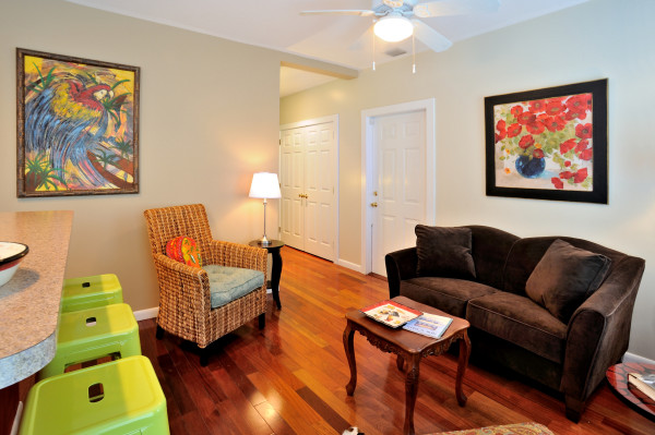 Second Great Room (“Red Room”): This room is decorated with island-inspired art and contrasting colors, including a large Dominican painting of a parrot and a red hibiscus painting. It features a chocolate brown loveseat, a woven banana grass chair, and an additional kitchen island, ideal for lounging, playing games, or watching TV.