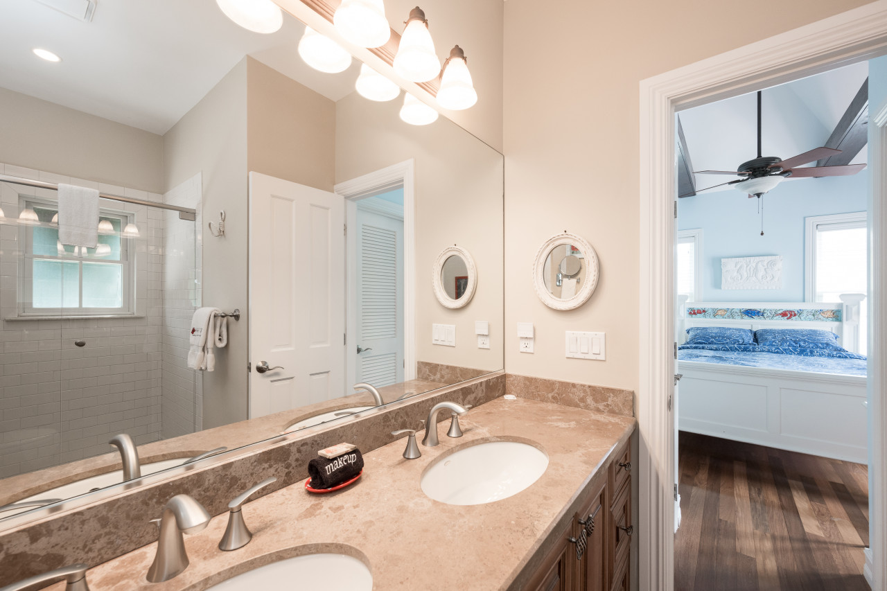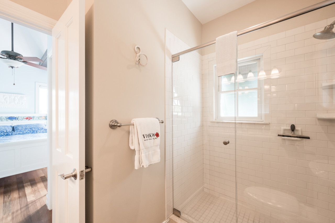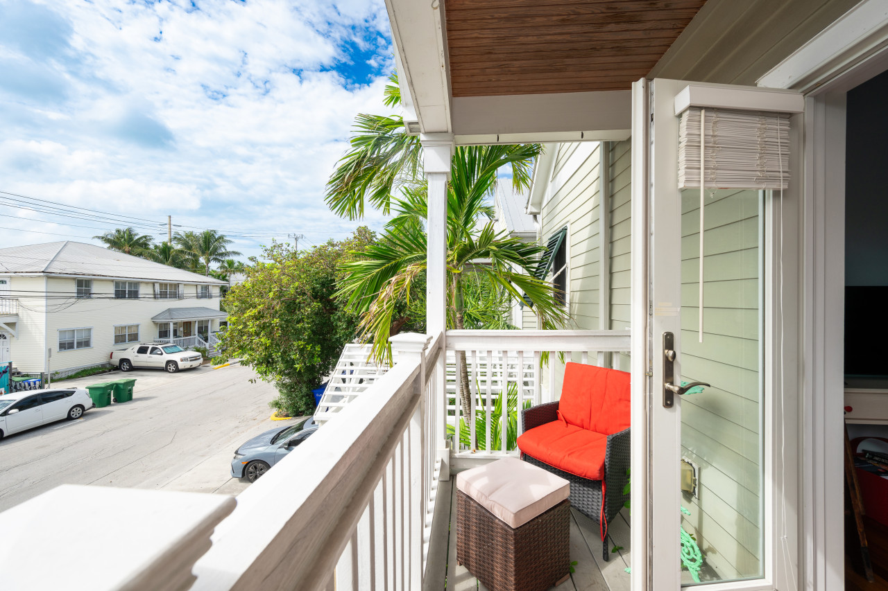 Inside, you’ll find a cheerful and functional layout that makes longer stays easy. The living room and kitchen share an open space with tall ceilings, island-inspired decor, and quality appliances. A separate dining room with pocket doors offers space for slow breakfasts, cuban coffee, and casual dinners. Upstairs, two queen suites each with their own full bathrooms offer comfortable beds and ample closet space. Both rooms also have their own private balconies for downtime or solitude if you’re here as a couple, family, or hosting weekend visitors.