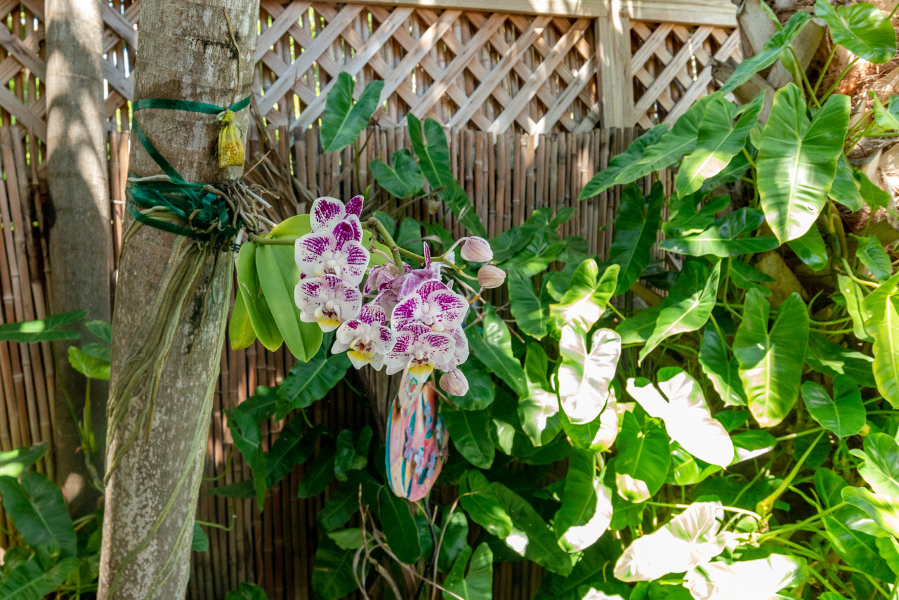 Finally, we step outside to experience the exotic pool-garden, offering a dipping pool with trickling waterfall, and a small wooden deck. Completely fenced in, the pool backdrop is lushly planted garden with palm trees and a beautiful variety of tropical foliage. Established orchids wind their roots around the tree trunks, and it’s really magical when they bloom.