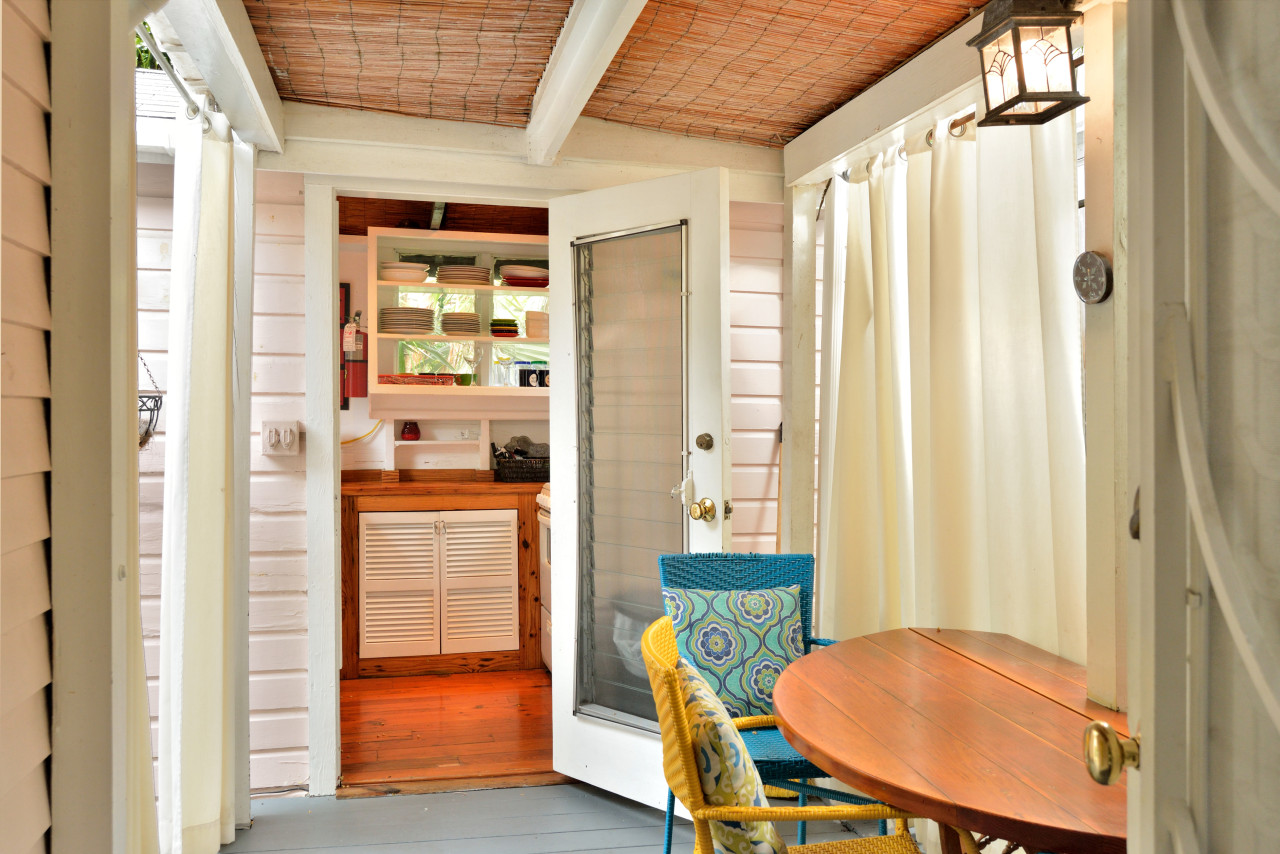 Immediately through the door joining the living room, is a charming covered breezeway that doubles as the al-fresco dining room. Canvas curtains are hung on both sides and serve to nicely close off the room if you choose to do so, creating an indoor / outdoor dining space. Another seafaring style lantern above wooden drop-leaf dining table maintain the historic nautical ambiance.