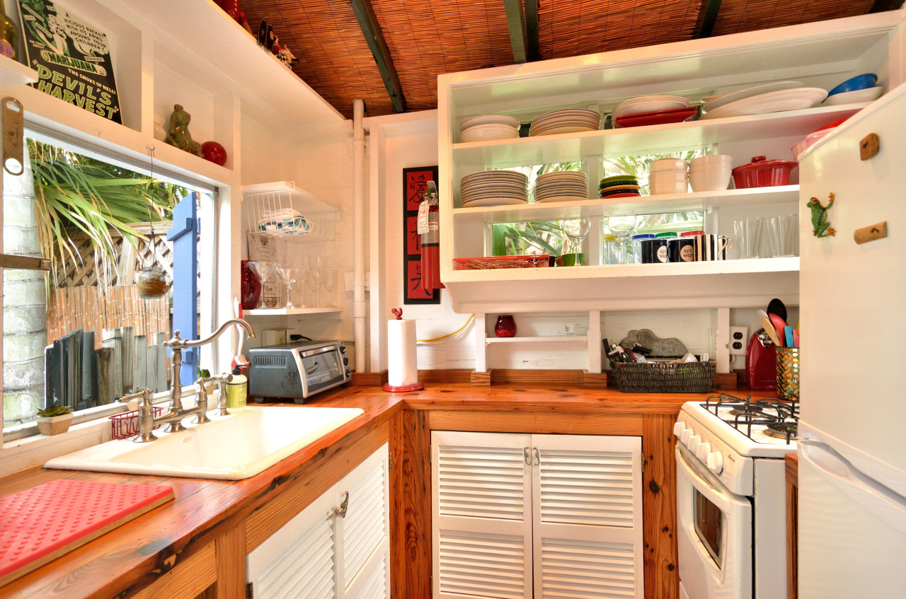 Back out to the dining area, we turn left and head to the Caribbean style kitchen. The concept of the ‘adjacent cookhouse’ was a standard design in the tropics when this cottage was originally built in the 1880’s. In those days, this layout was meant to be strictly functional – to protect the main house from the kitchen heat and smells. Today, it’s as fun as it is functional, creating a unique space to cook in, that enhances an authentic ambiance which most people appreciate once they’ve experienced it.