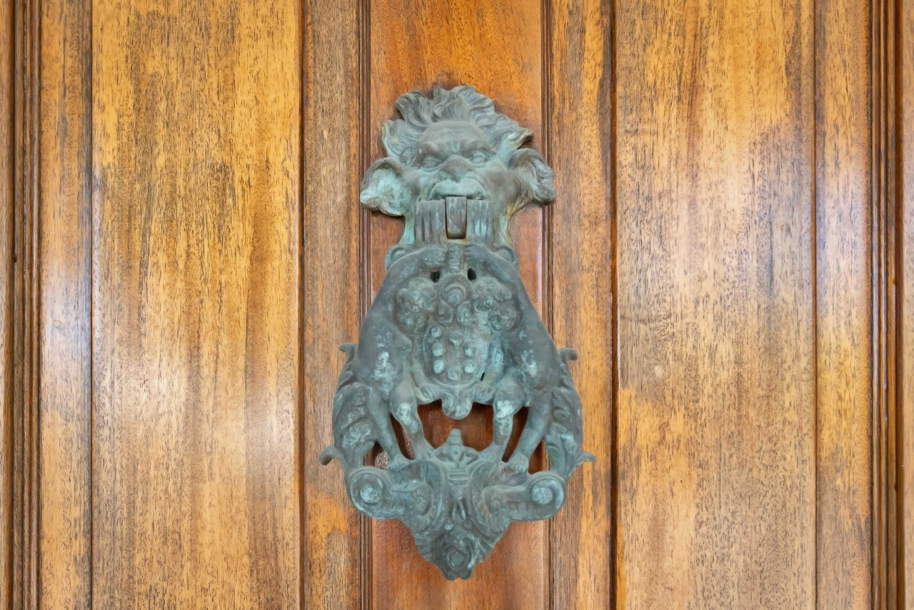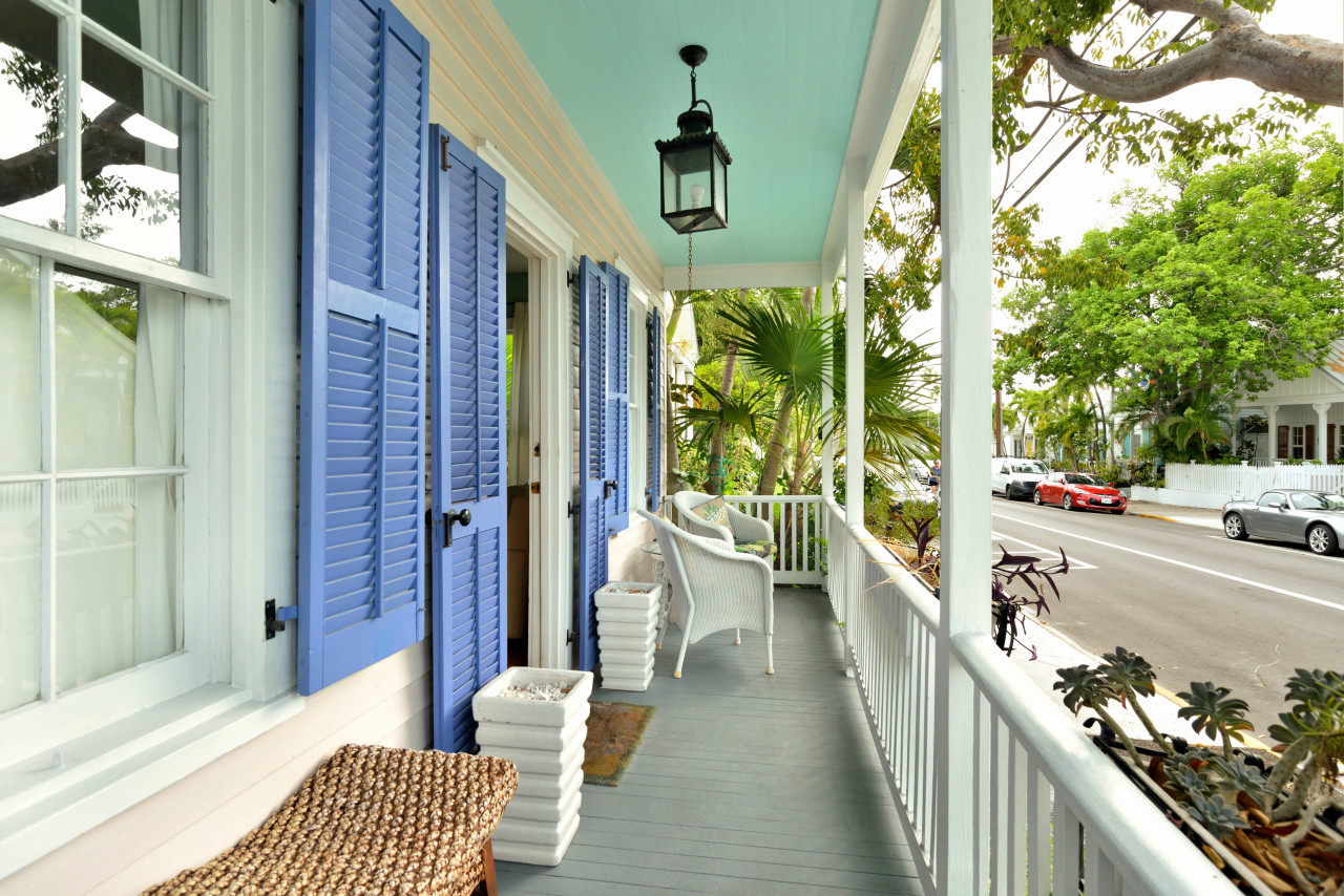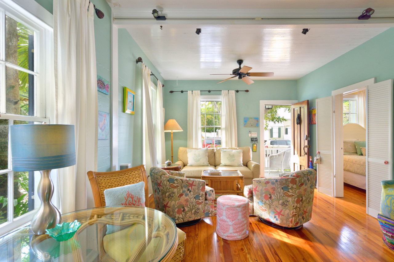 We begin our tour curbside at the front of the house, where craftsman story-book qualities and beautiful colors create a delightful scene. A 12-foot high porch ceiling is painted haint blue and topped with a pronounced saw-tooth roof. Pink wood-slat siding, periwinkle blue window shutters, and a sitting porch spanning the width of the house, create an outside setting perfect for watching the world of Key West go by. Wide-sash six-pane wood windows are set symmetrically on either side of the varnished wood front door (complete with patina bronze knocker), and a seafaring lantern hangs in the center of the porch ceiling.