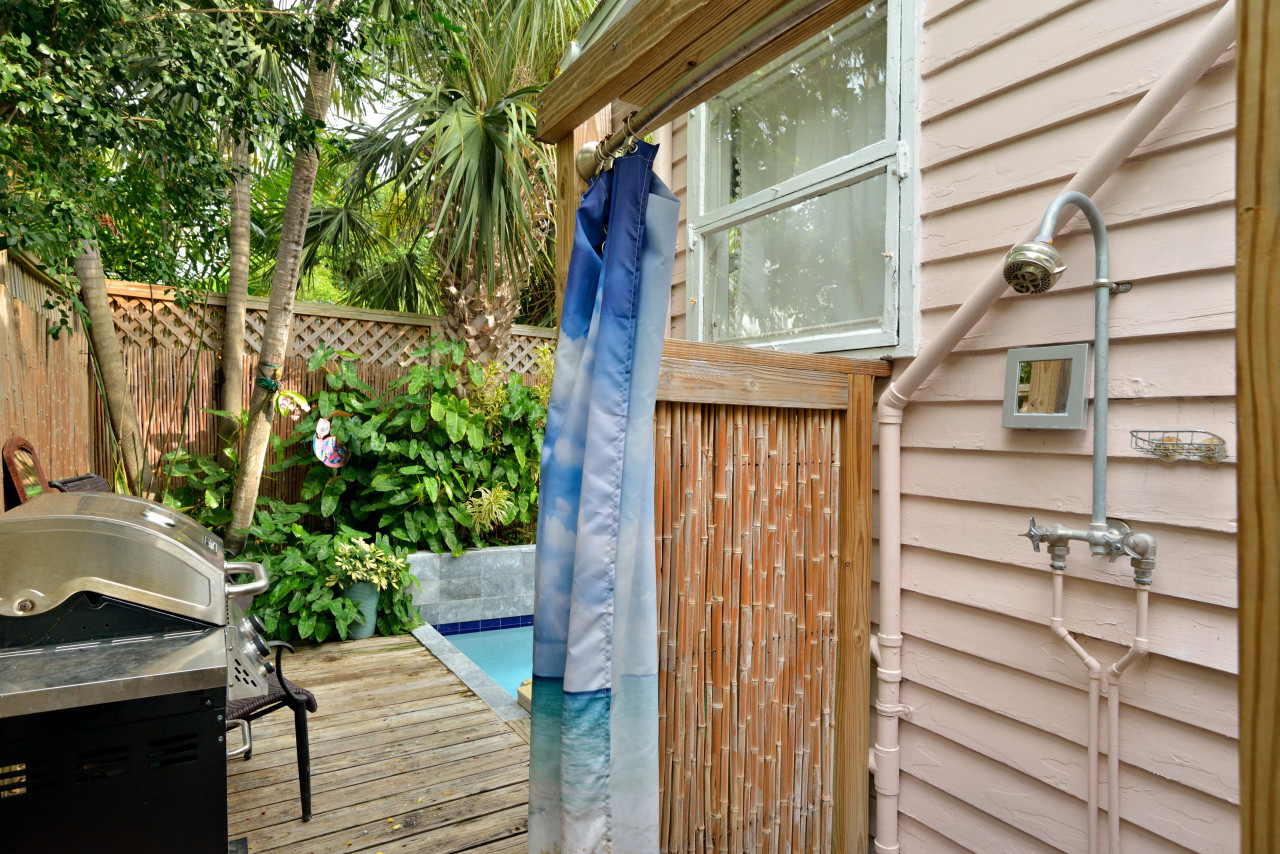 Walking past the pool, to the other side of the garden, the wood deck narrows, but there is plenty of room to walk to the other side where it widens again. At the corner, we find the BBQ grill, and outdoor dining set. Where the deck rounds the corner of the house, you’ll find the laundry closet plus another fun feature – an outdoor pool-shower. The outdoor shower offers hot and cold water, and since it’s located on the outside wall from the bunkhouse bedroom it can serve as a shower for that bedroom. From this side of the yard, there is also a garden gate leading out to the front of the property on Southard Street.