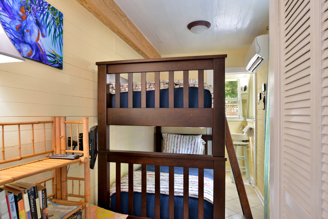 Before we proceed to the cookhouse, let’s pass through the doors directly across from the dining table, and look at the second bedroom, with en-suite sink and commode. Set up as a fun tropical style bunk-room, this bedroom provides a set of wood slat twin-size (single) bunk beds, a TV, and a book shelf with small library.
