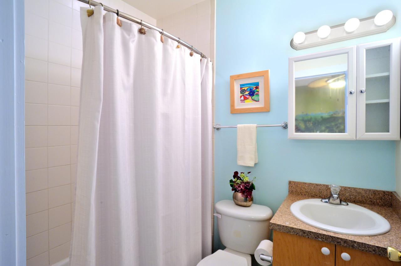 Bedroom Two is spectacularly creative, when you enter it, it feels like you’re walking into a ‘Still-life’ garden painting. Definitely the wild-card of this property, the owner loves the enchantment of Key West gardens and the idea was to make it possible to sleep in the garden while comfortably staying inside. To create this sleep-in art piece, a master carpenter built a custom ‘picket-fence’ headboard. Then artist David Wegman painted an alluring fantasy tropical garden as the background, complete with hand painted bricks you would swear are the real thing. When you sleep ‘in the garden’ you have two twin beds, that can also be pushed together to make a king. The en-suite bathroom provides a bathtub with in-tub shower (with hand wand), and vanity sink.