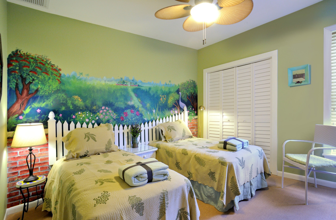The artistic focal points are two custom life-sized hand painted murals. One piece features the Mile 0 monument with all its prominent characteristic, and encompasses an entire wall, from floor to ceiling, in a living room/ kitchen area. The other mural is of a life-size fantasy garden mural in the bedroom two, complete with picket fence, which gives a convincing illusion of sleeping in a tropical garden.