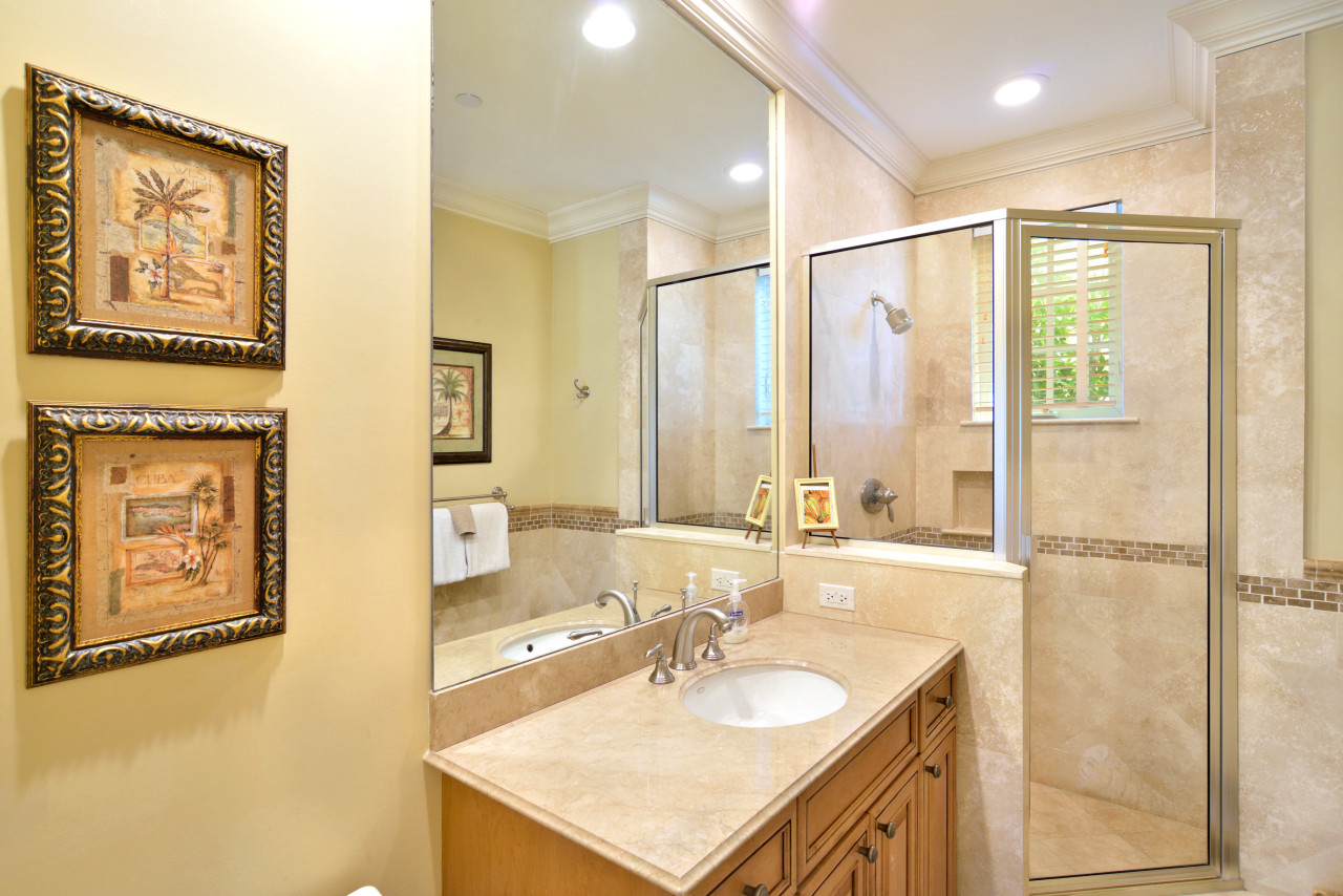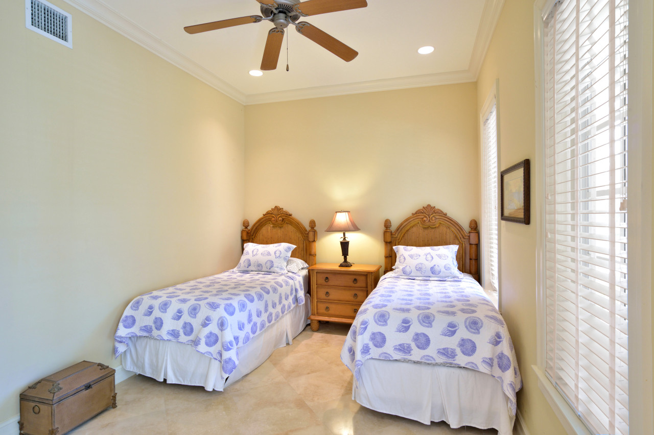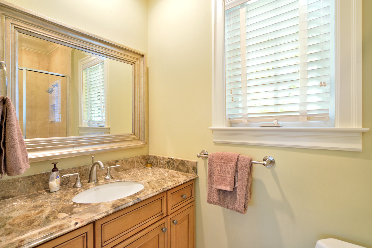 Bedroom One: Step into the entrance hall, pass by the banister staircase, and immediately to the right is the 1st floor bedroom. Stylized with ornately wood carved headboards, bedroom one is furnished with two twin beds. The spacious private porch for this bedroom, has a pleasing view of the landscaped front yard. Stepping back into the hallway to the right, is the 1st floor bathroom. Done in earth-tone granite, this bathroom has a large single vanity and sink, and corner shower large enough for two.