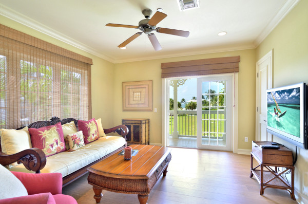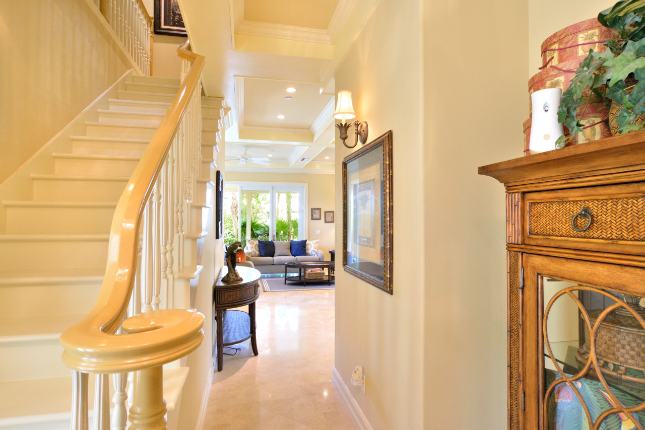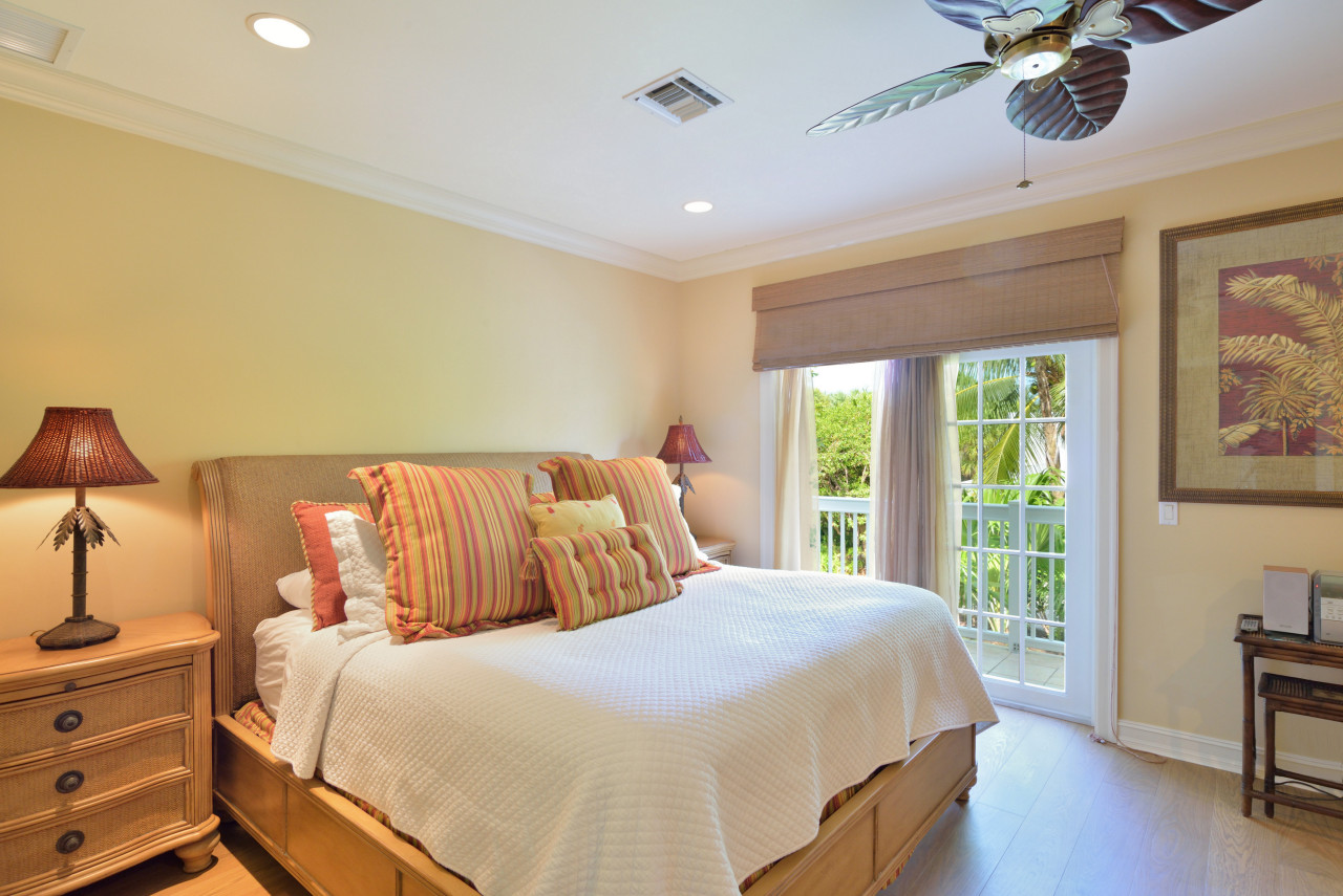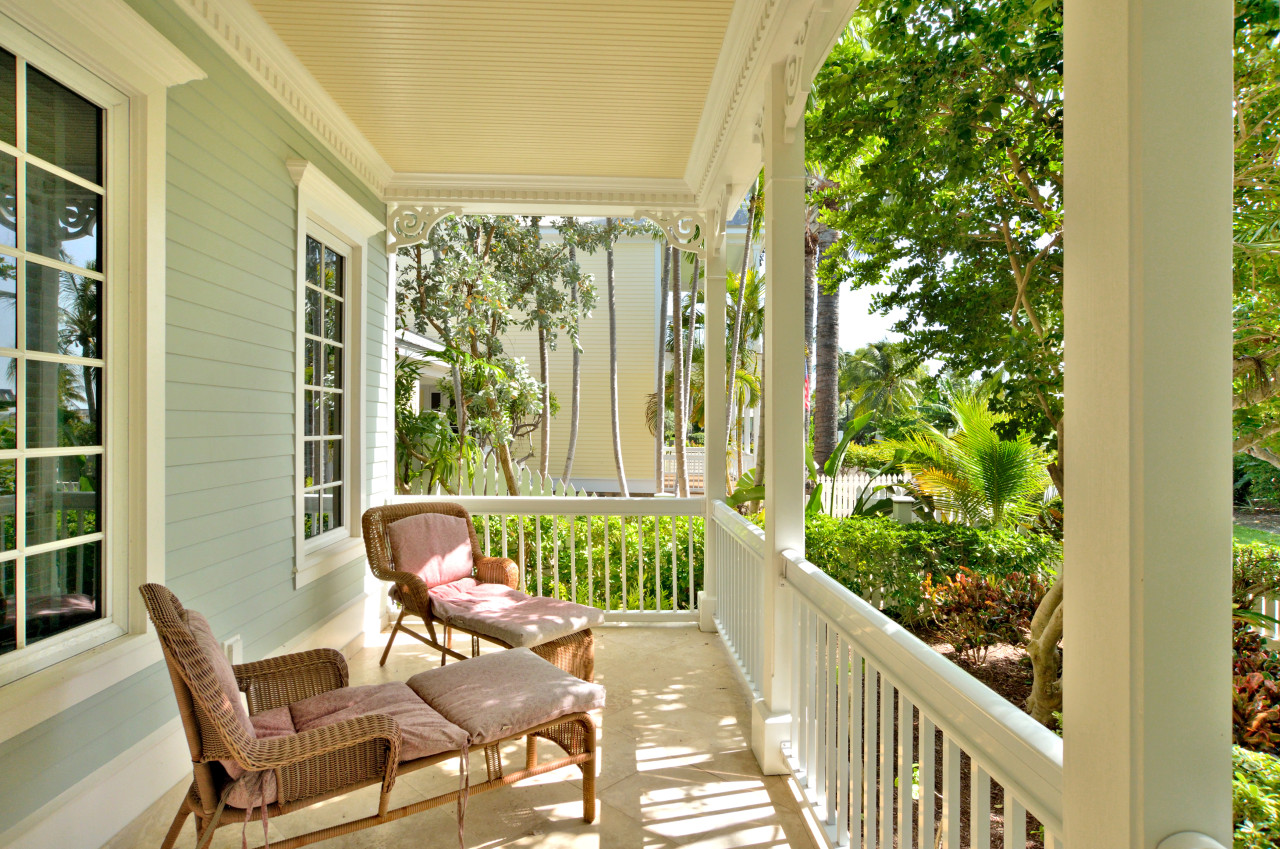 Throughout the interior, the designer created an ambience of understated elegance, befitting the stature of Sunset Key. Evoking a distinctive ‘Tommy Bahama’ feel, tropical furnishings throughout are casual yet sophisticated-done in soft Caribbean earth tones, wicker, wood, and bamboo. Wall colors of sunshine yellow are trimmed with bright white crown molding throughout. A fabulous feature of the Key West Sunset Sojourn vacation rental is that each bedroom has its own covered porch, accessed through a private exterior entrance.
