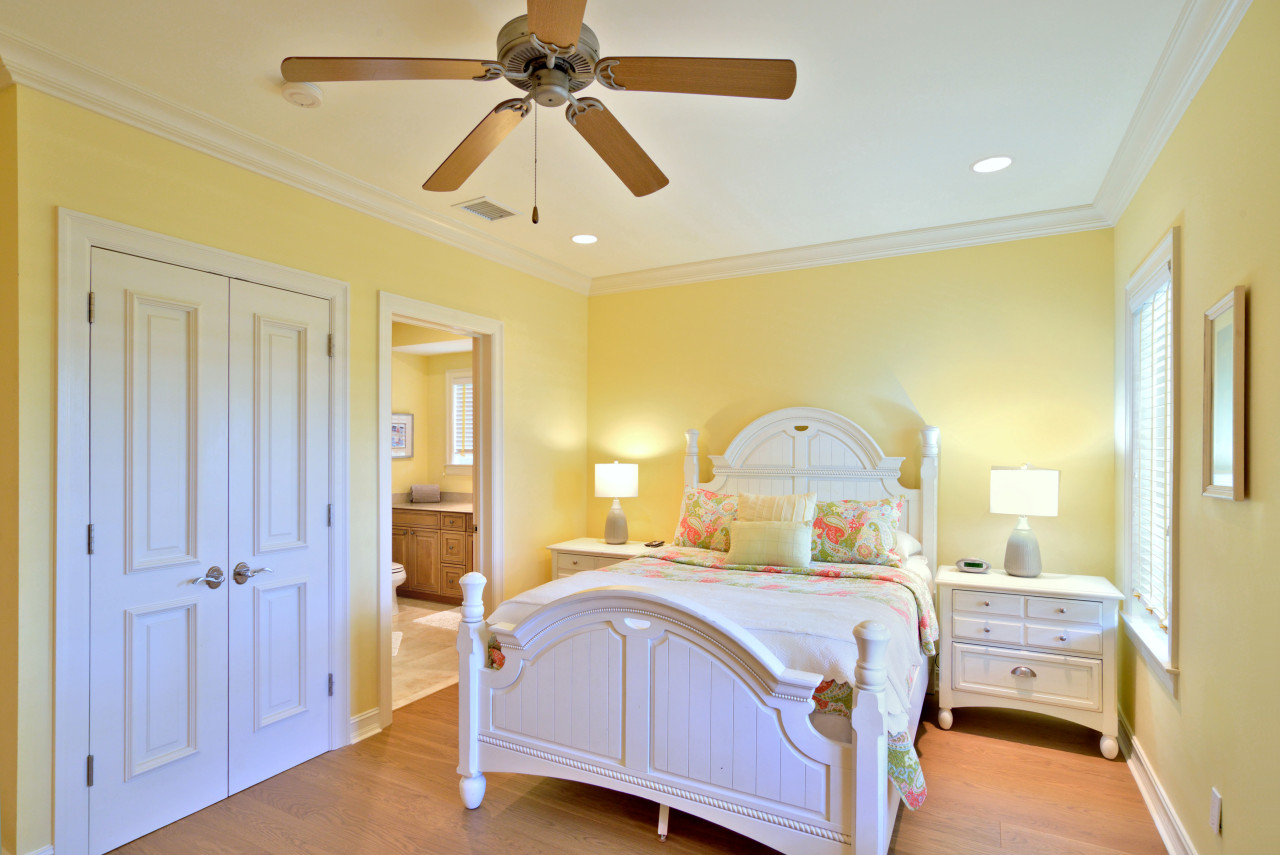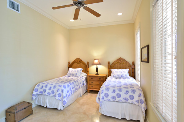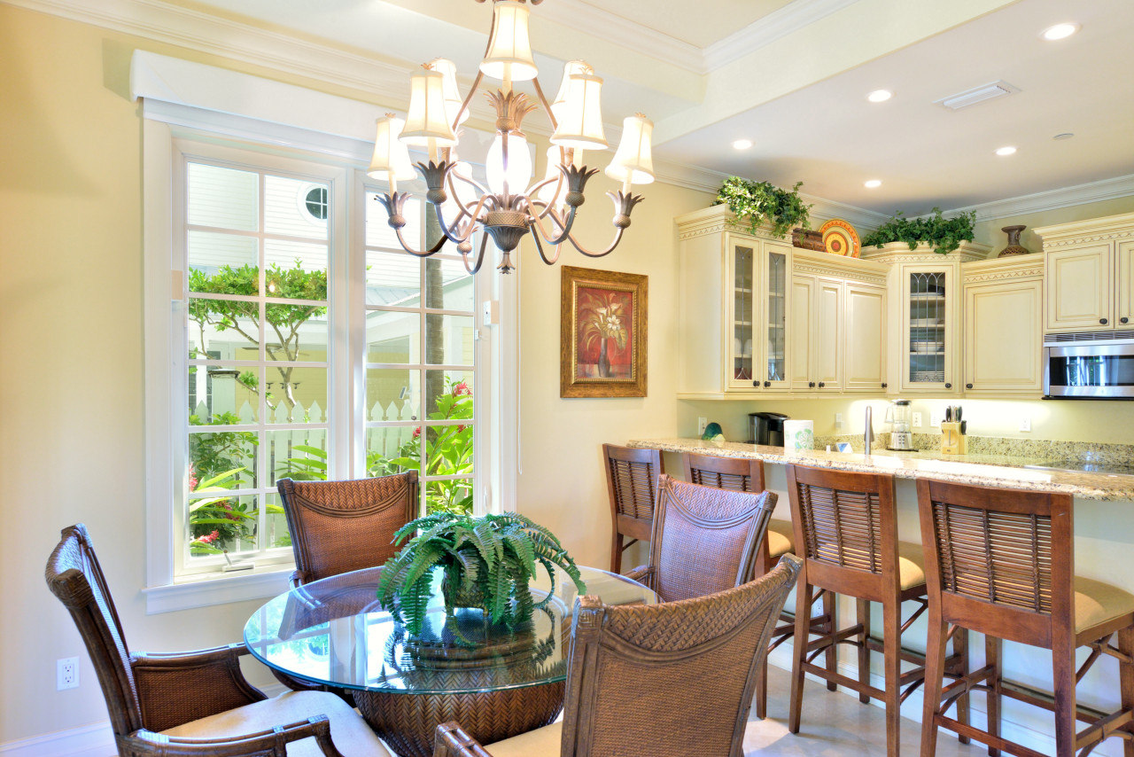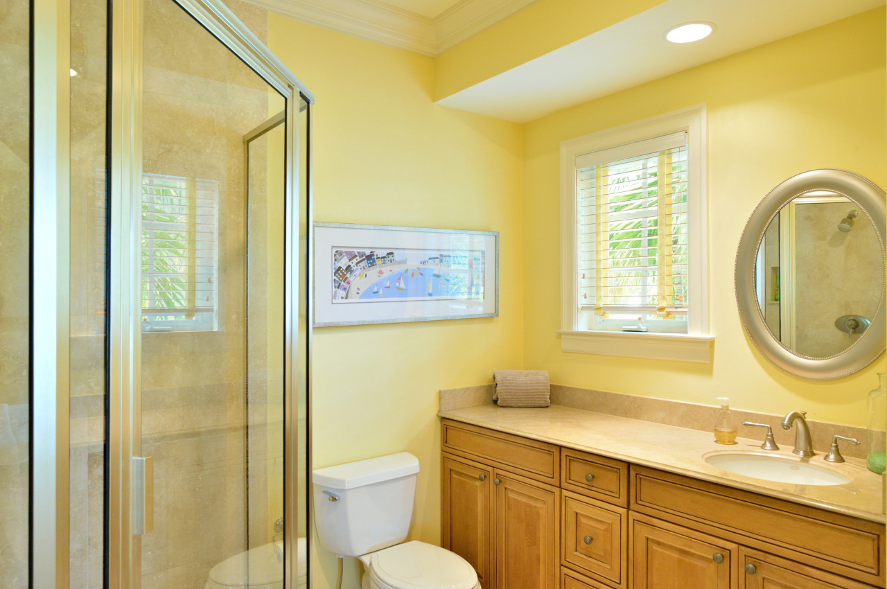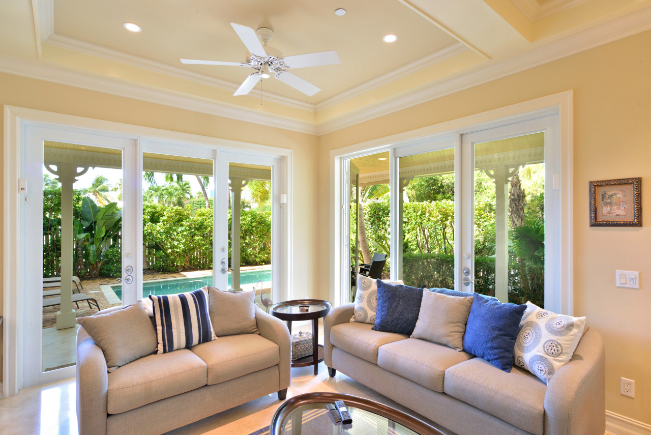 Throughout the interior, the designer created an ambience of understated elegance, befitting the stature of Sunset Key. Evoking a distinctive ‘Tommy Bahama’ feel, tropical furnishings throughout are casual yet sophisticated-done in soft Caribbean earth tones, wicker, wood, and bamboo. Wall colors of sunshine yellow are trimmed with bright white crown molding throughout. A fabulous feature of the Key West Sunset Sojourn vacation rental is that each bedroom has its own covered porch, accessed through a private exterior entrance.