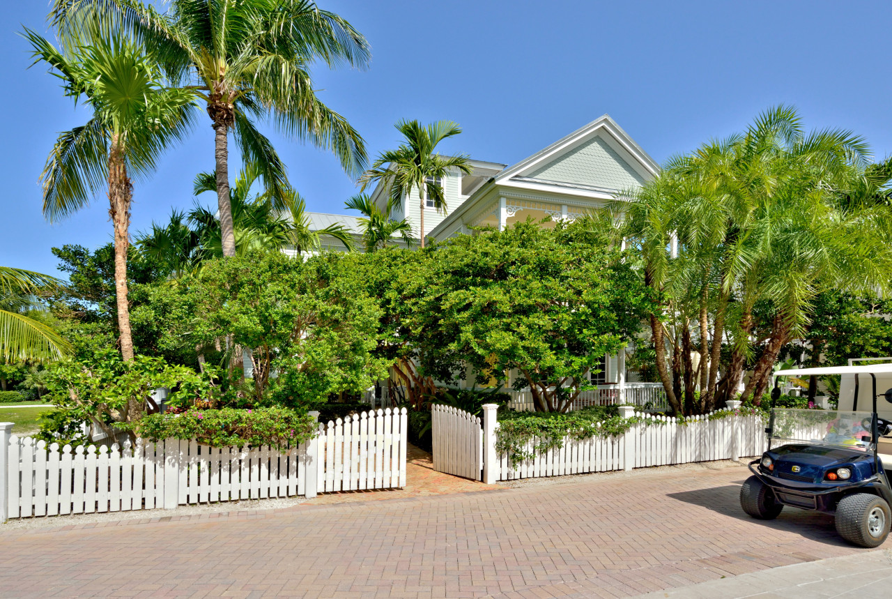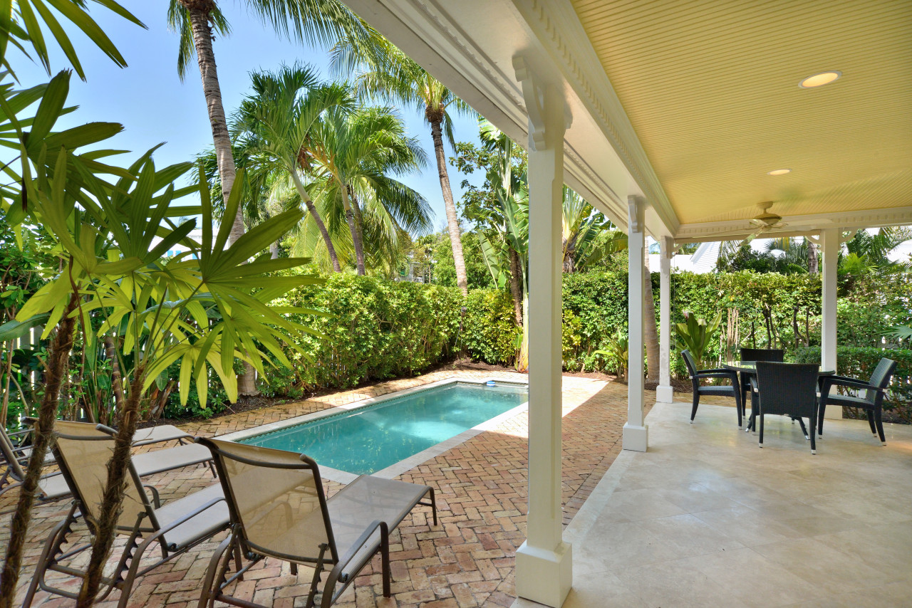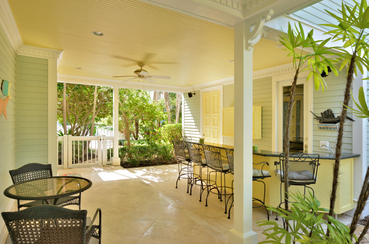 Follow the brick roadway, through the Sunset Key neighborhood past beautiful Key West cottage-style homes, framed with tropical landscaping and white picket fences. When you arrive at the Sunset Sojourn house, enter the property through the front gate. Beyond the gate, aged brick pavers hardscape the grounds, keeping it sleek and uncluttered. Follow the path to the elegant entertainment portico. Built along the side of the house, white beams with gingerbread trim, yellow beadboard ceiling, marble tile and a full size wet-bar complete this cottage-style indoor-outdoor room. The portico then seamlessly extends to a spacious covered porch that wraps around the entire side and back of the house.