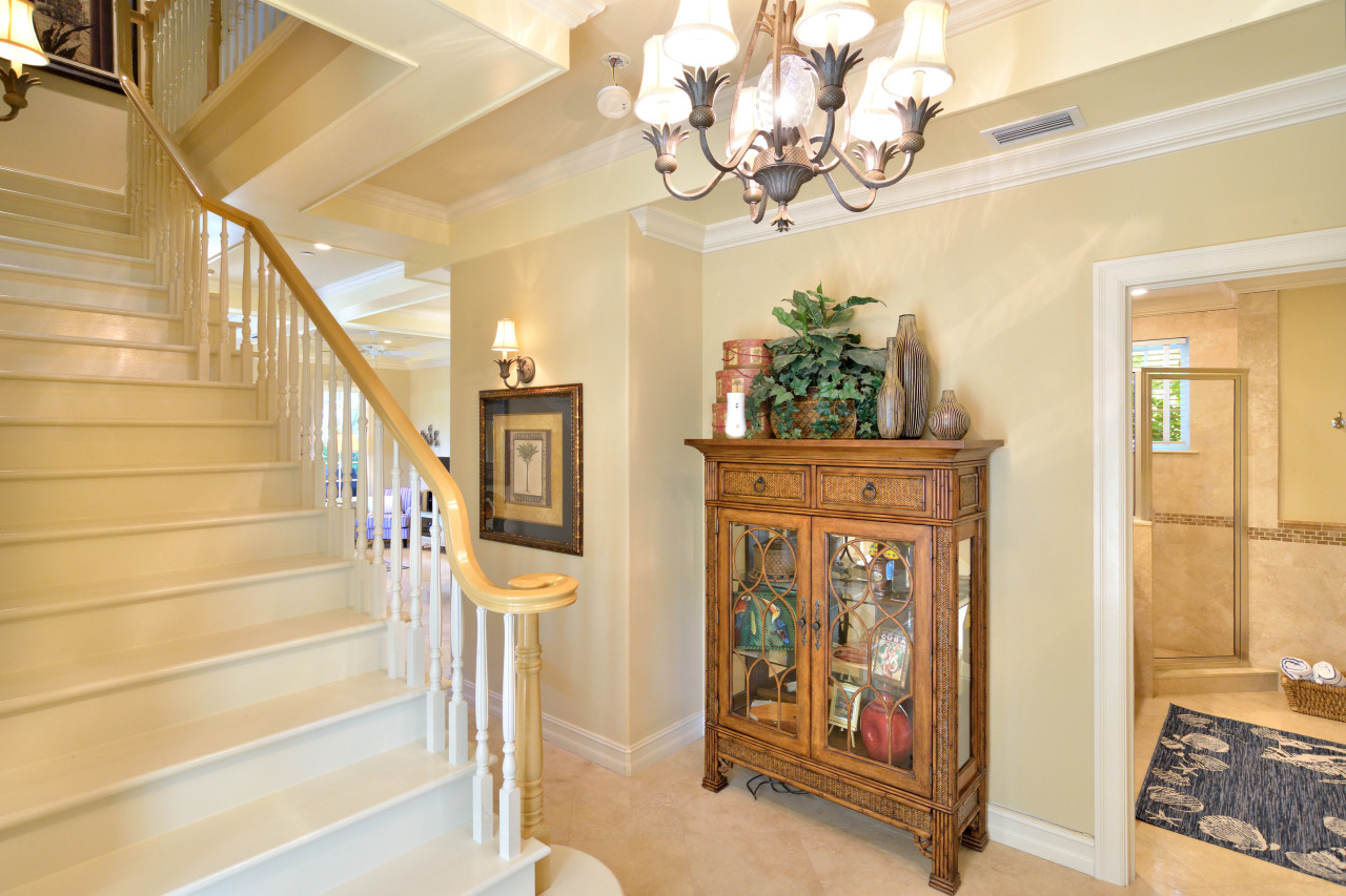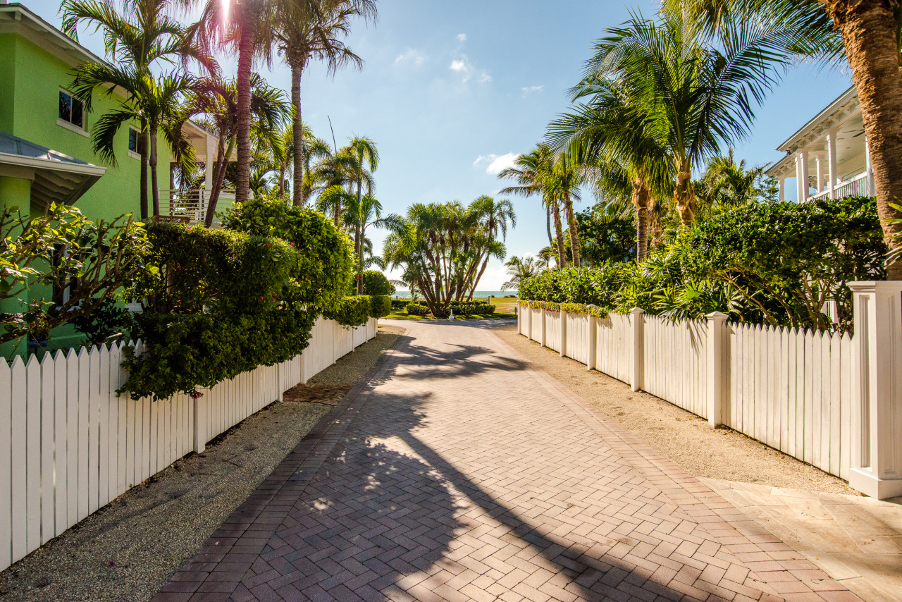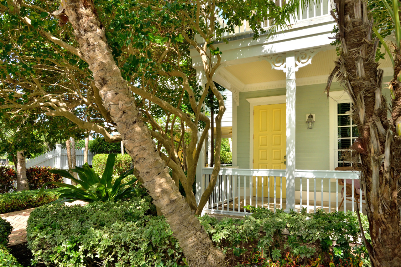 Follow the brick roadway, through the Sunset Key neighborhood past beautiful Key West cottage-style homes, framed with tropical landscaping and white picket fences. When you arrive at the Sunset Sojourn house, enter the property through the front gate. Beyond the gate, aged brick pavers hardscape the grounds, keeping it sleek and uncluttered. Follow the path to the elegant entertainment portico. Built along the side of the house, white beams with gingerbread trim, yellow beadboard ceiling, marble tile and a full size wet-bar complete this cottage-style indoor-outdoor room. The portico then seamlessly extends to a spacious covered porch that wraps around the entire side and back of the house.