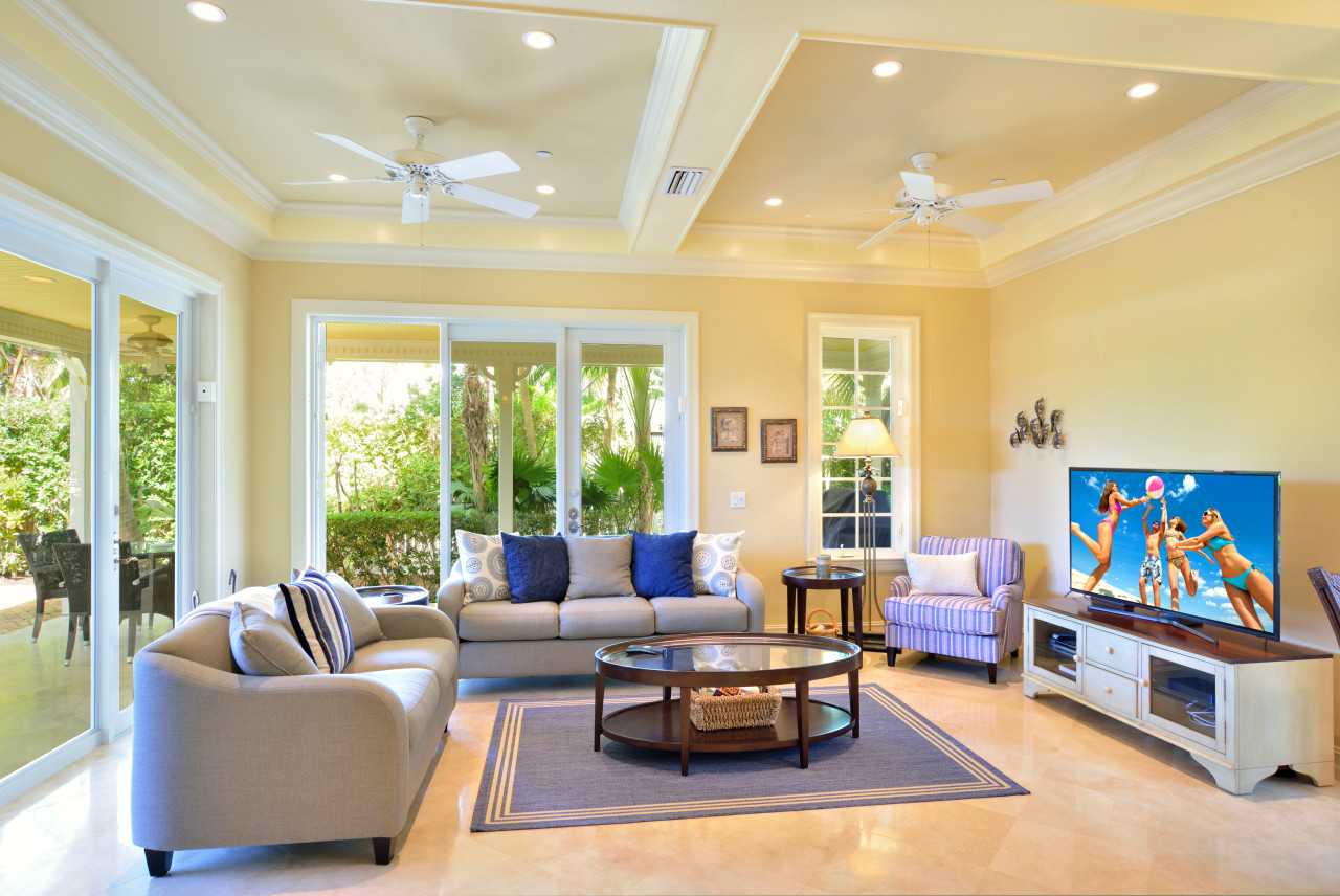 Living room: Returning to the hallway, and to the right, the spacious open-concept great-room is straight ahead. The living room is furnished for comfort as well as style with a cushy earth-tone sofa and loveseat, easy chair, and a large flat screen TV. A large dark wood round coffee table, matching end tables, plus artwork and mirrors framed with dark tropical wood and wicker frames reflect the island location of the home. Two sets of French doors lead to the covered porch, provide a view and easy access to the pool and the covered porch.
